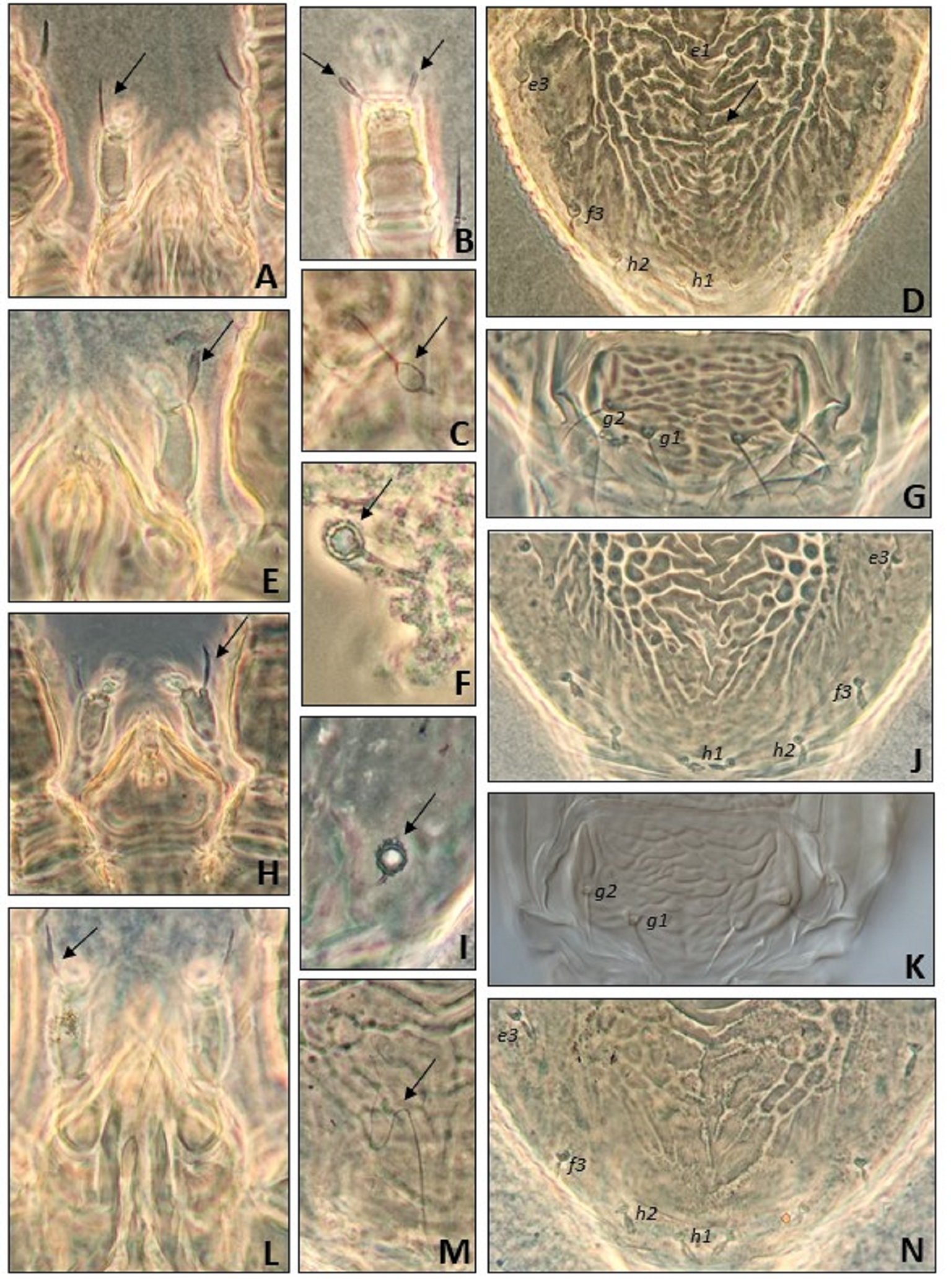 — Opisthosoma with setae e3, f3, h1, h2 moderately broad, 7–10 μm long (Figure 5N); spermatheca vesicle not visible, spermathecal duct ends in a membranous bulb (Figure 5M)