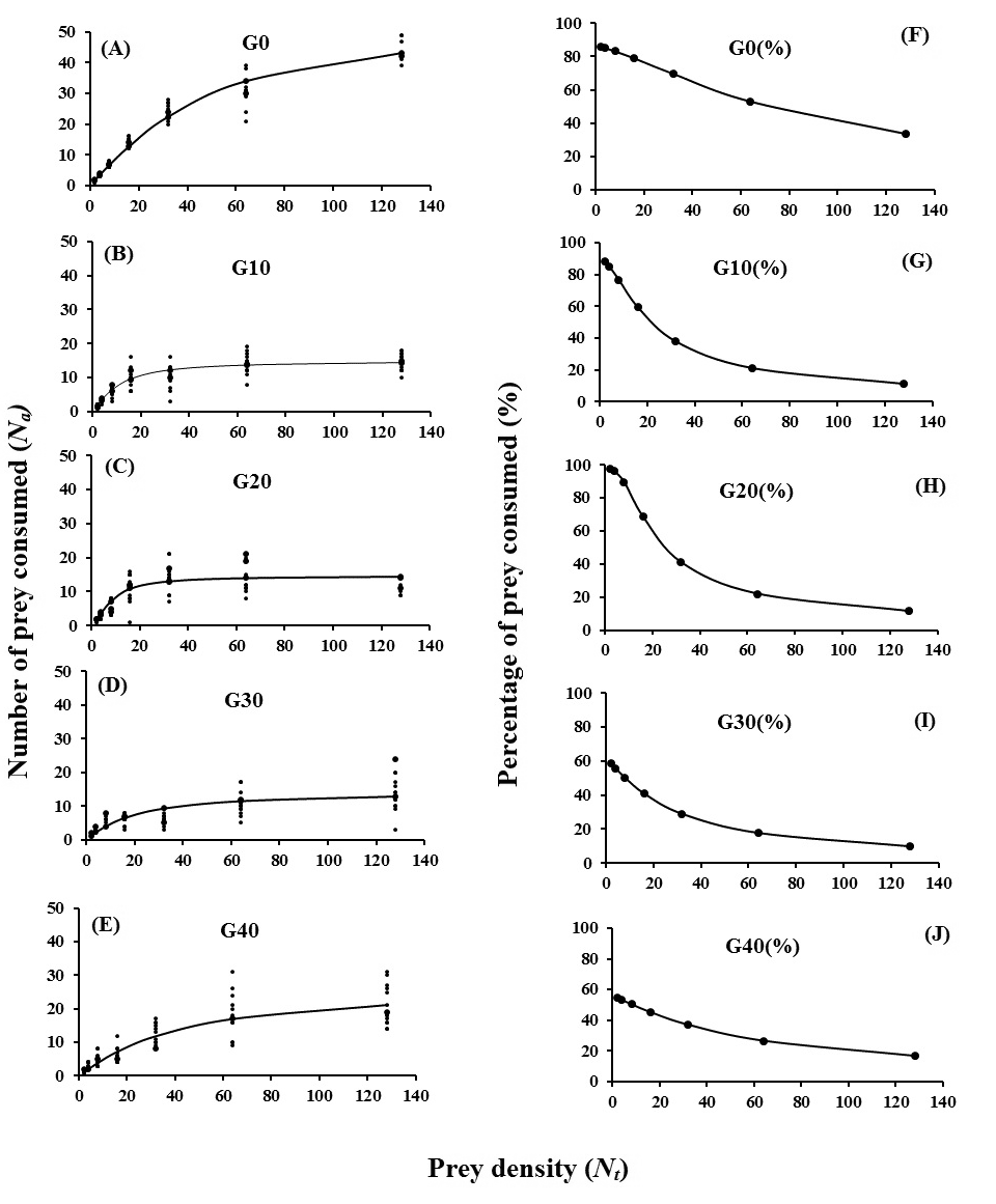 Experimental arenas composed of a 3×3 cm bean leaf disc, were placed on a water-saturated cloth pad in a Petri dish (8 cm diameter). Then, Petri dishes were placed in the middle of a larger Petri dish (10 cm). The edges of the bean leaf disc were covered with wet tissue paper drenched in the water to prevent predators from escaping and to provide a water source. To obtain prey mites of the same age, 150 gravid females of T. urticae were randomly taken from the colony and transferred to a bean leaf disc (4 × 7 cm). After 24 h, T. urticae females were removed from the arenas. Plastic containers with T. urticae eggs were kept and monitored until the emergence of deutonymphs. The newly emerged deutonymphs of T. urticae were transferred onto leaf discs with a fine paintbrush (number 000) at densities of 2, 4, 8, 16, 32, 64, and 128 per experimental unit. To obtain same-aged predatory mites, 100 gravid females of N. californicus reared on thorn apple pollen were randomly taken from the colony and transferred to a new rearing environment containing pollen. After 24 h, N. californicus females were removed from the arenas. Plastic containers with N. californicus eggs were kept and monitored. After emergence of the larva, they were reared on thorn apple pollen to reach adult stage. The newly emerged mated females of the predator (24 h old) after 24 h harvesting, were placed individually in experimental arenas containing different densities of T. urticae deutonymphs. This procedure repeated in G0, G10, G20, G30 and G40. After 24 h, the number of prey consumed by each female predator was counted and then predators transferred to new leaf discs without T. urticae deutonymphs to determine the numerical response. Then, the total number of eggs laid by the predatory mite over 48 hours was recorded to estimate the numerical response. Fifteen replicates were prepared for each prey density. All experiments were conducted in the laboratory at 25±1 °C, 60±10% RH and 16:8 h L: D photoperiod.
