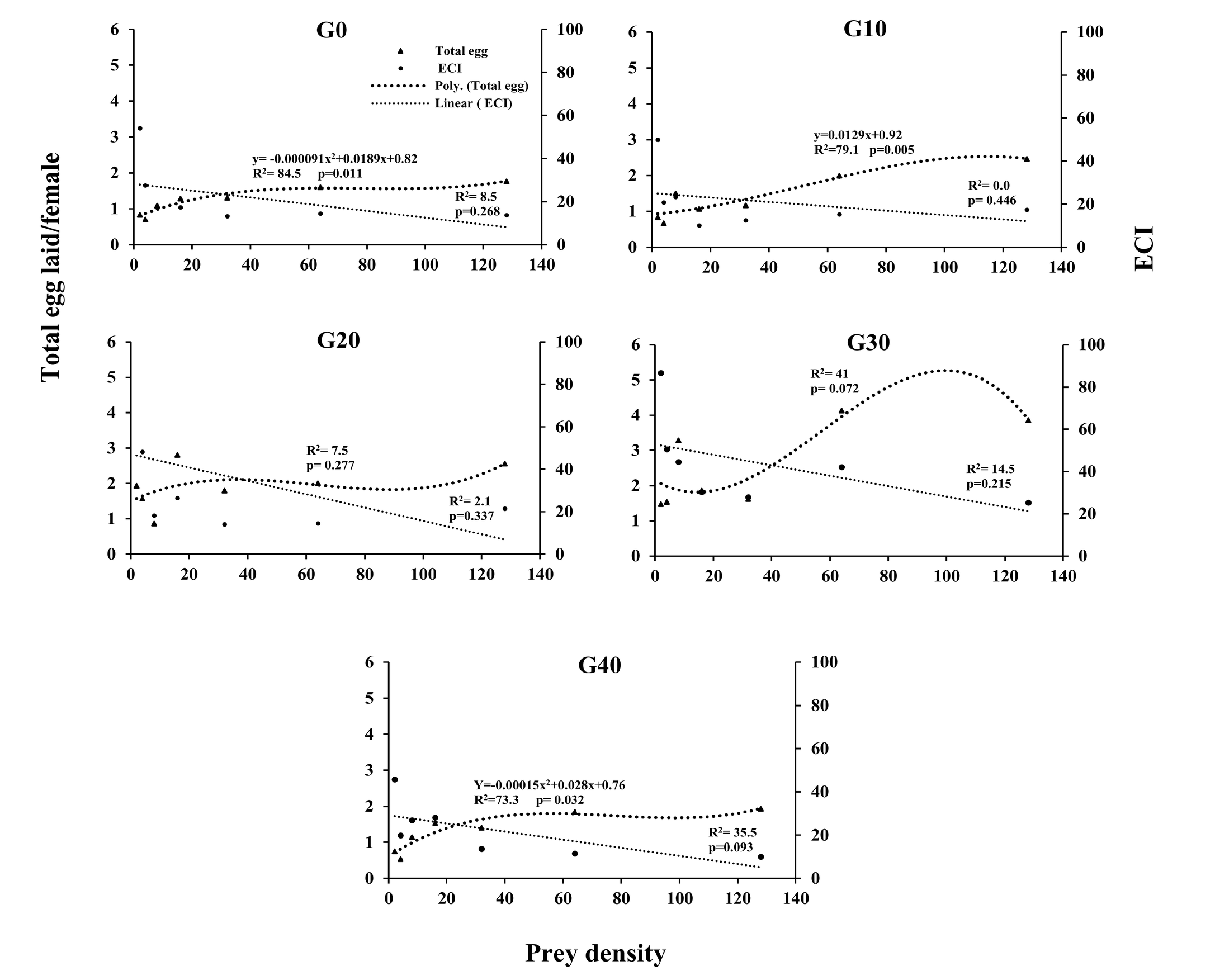 The results of linear and nonlinear regression analyses of the relationship between the prey density and eggs laid and ECI in different generations of N. californicus are shown in Figure 2. The relationship between the prey density and eggs laid in G0, G10 and G40 was significant, and the number of laid eggs increased with increasing the density. The relationship between the number of eggs laid and the prey density was linear in G10, whereas it was nonlinear in G0 and G40. The relationship between the prey density and ECI was not significant in all tested generations (Fig 2).