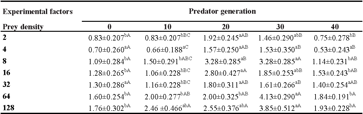 The effects of prey density and predator generation on the predation rate of N. californicus on T. urticae deutonymph, as well as the interaction between them were significant. There was a significant difference among seven offered prey densities in every generation (Table 3). In almost all generations, the consumption rate increased with increasing the prey density (Table 4). In most generations, the highest mean consumption rate was observed at densities of 64 and 128 (Table 4). The lowest and highest number of prey consumed by N. californicus were observed at density of 2 in G10 (1.50 prey) and at density of 128 in G40 (20.73 prey), respectively (Table 4). There was no significant difference in daily consumption of predator at densities of 2, 4 and 8 among generations, but in other densities the consumed prey among generations was different (Table 4).