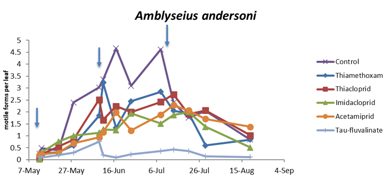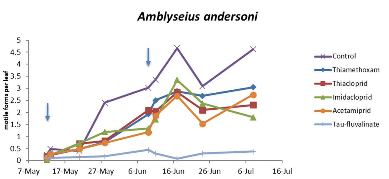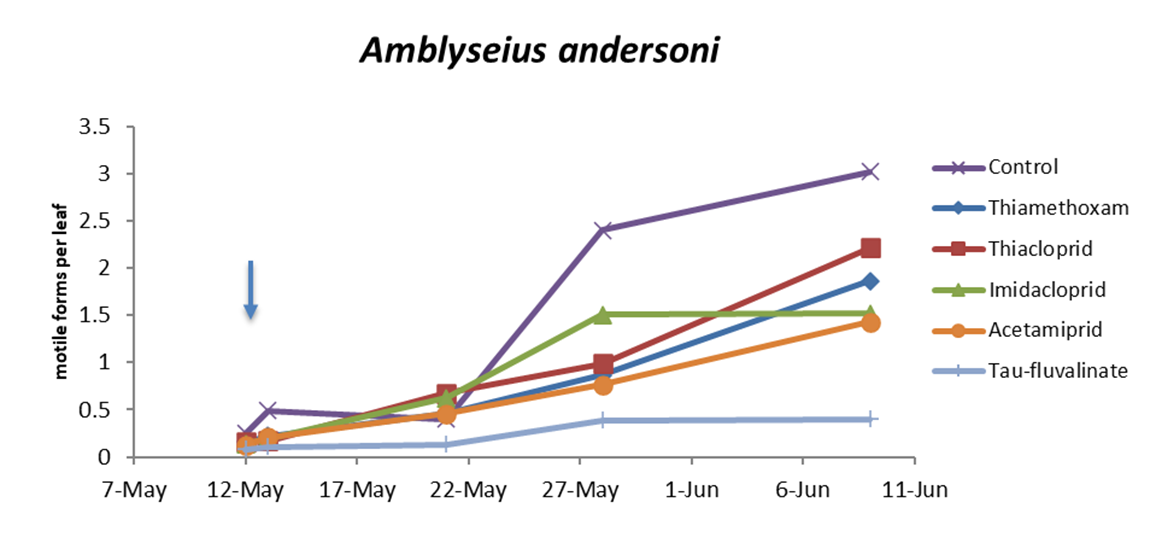 Results: Field experiments showed a decline in predatory mite numbers in plots treated with neonicotinoids or tau-fluvalinate compared to the untreated control. However, predatory mites in neonicotinoid plots reached higher densities compared to those recorded in tau-fluvalinate plots. Spider mite (Panonychus ulmi) populations reached moderate to high densities in plots treated with tau-fluvalinate while their densities were negligible in the remaining plots. Amblyseius andersoni survival was moderately affected by some neonicotinoids in the laboratory while they significantly reduced predatory mite fecundity. In contrast tau-fluvalinate exerted severe effects on survival and fecundity of predatory mites. Finally, escaping rate increased after pesticide exposure suggesting possible alterations in predatory mite behavior.