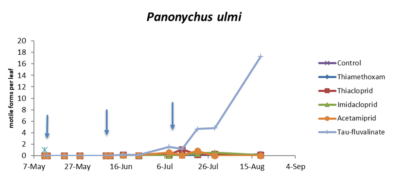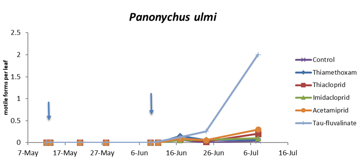 Figure 3. Seasonal abundance of Panonychus ulmi in the second field experiment. Arrows indicate the spraying dates.