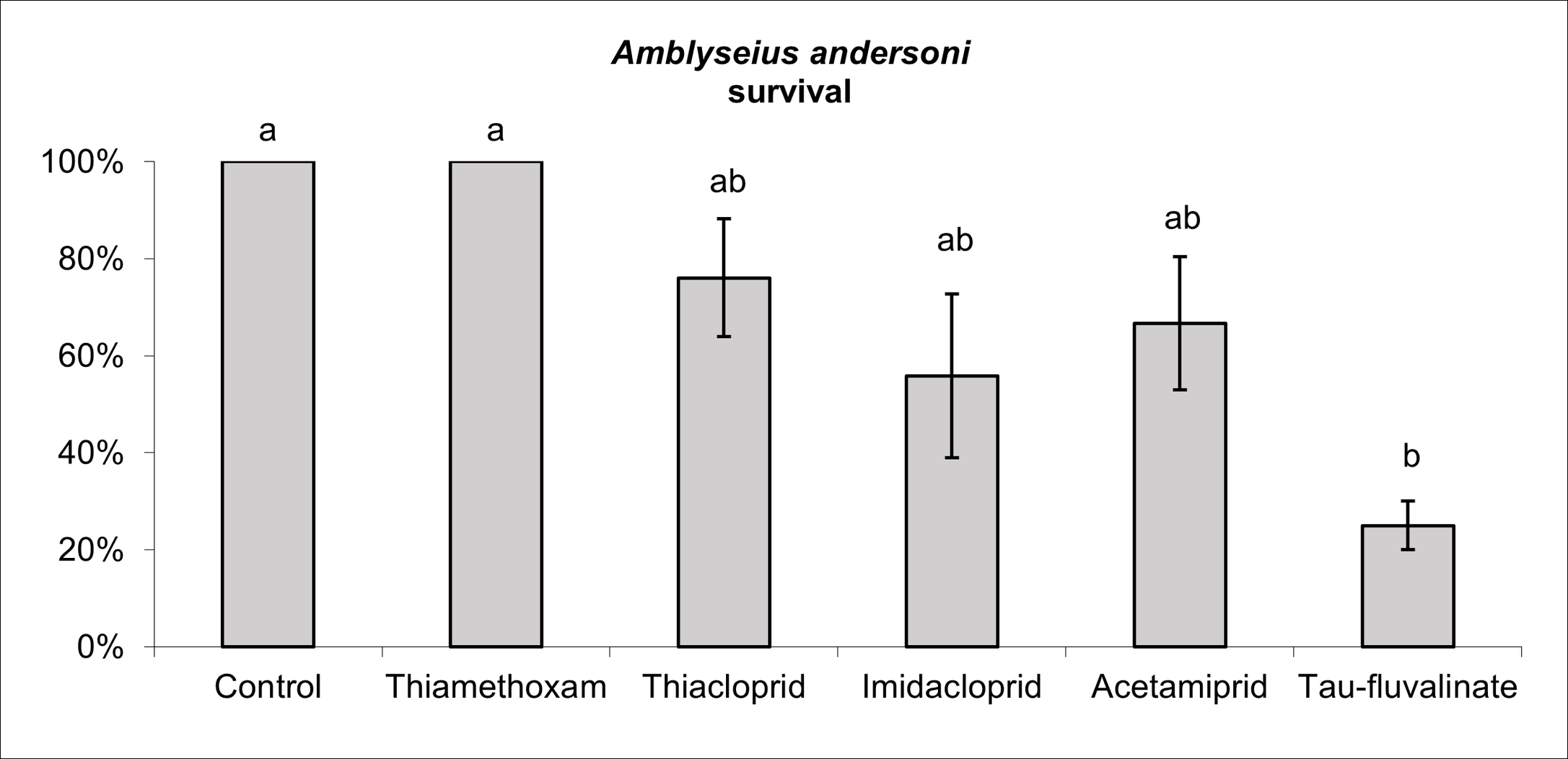 Figure 6. Survival of Amblyseius andersoni females exposed to fresh residues of a number of insecticides. Different letters indicate significant differences at Tukey–Kramer test (α = 0.05).