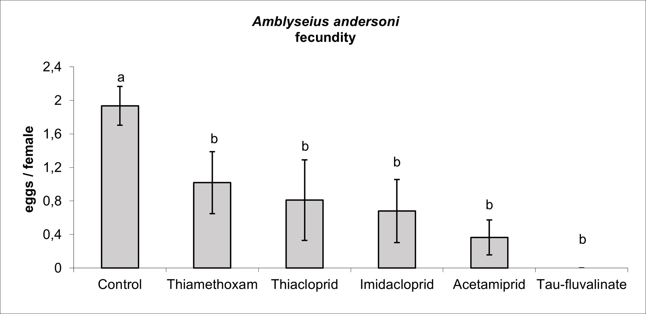 Figure 7. Fecundity of Amblyseius andersoni females exposed to fresh residues of a number of insecticides. Different letters indicate significant differences at Tukey–Kramer test (α = 0.05).