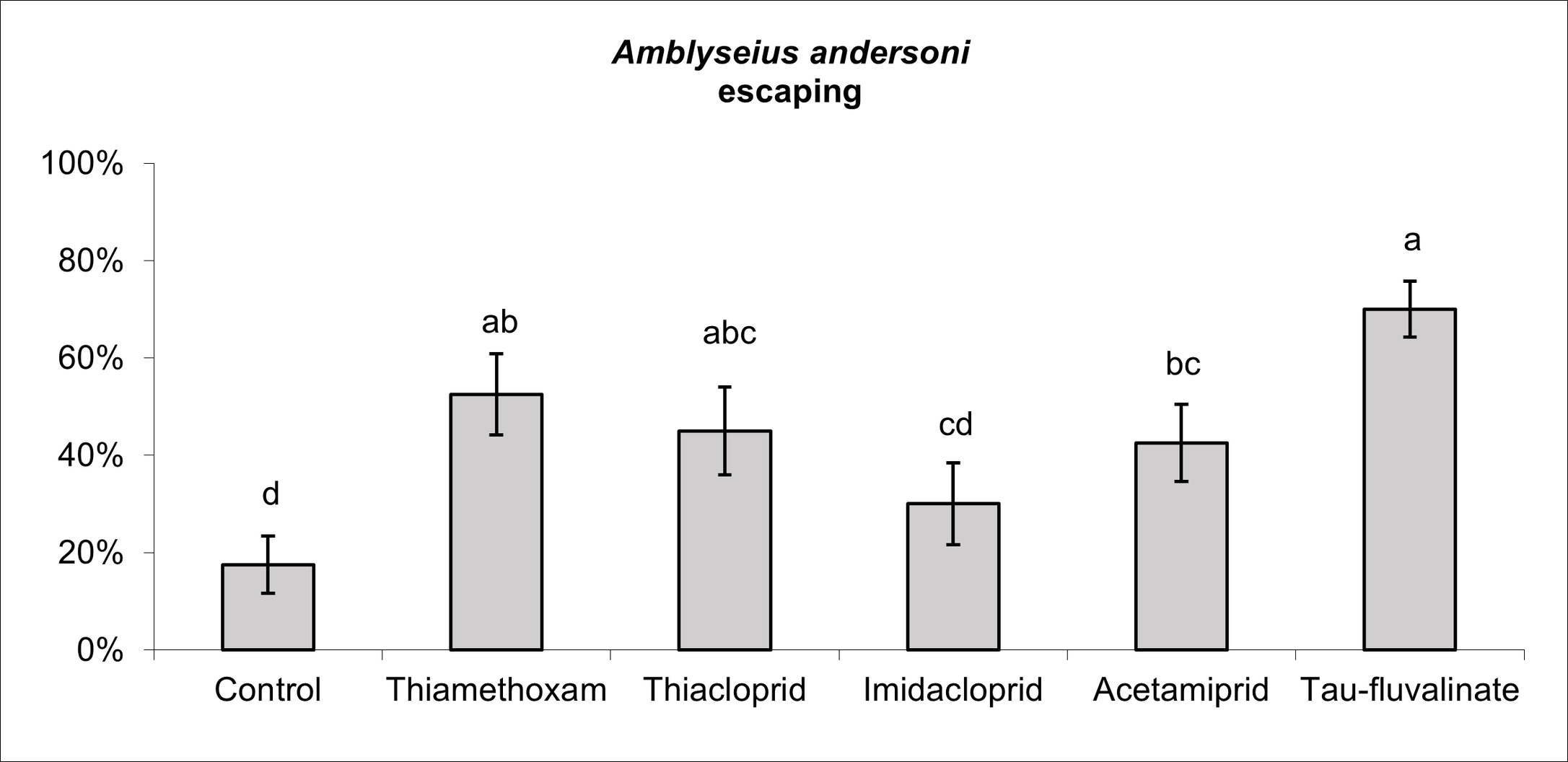 Figure 8. Escaping rate of Amblyseius andersoni females exposed to fresh residues of a number of insecticides. Different letters indicate significant differences at Tukey–Kramer test (α = 0.05).