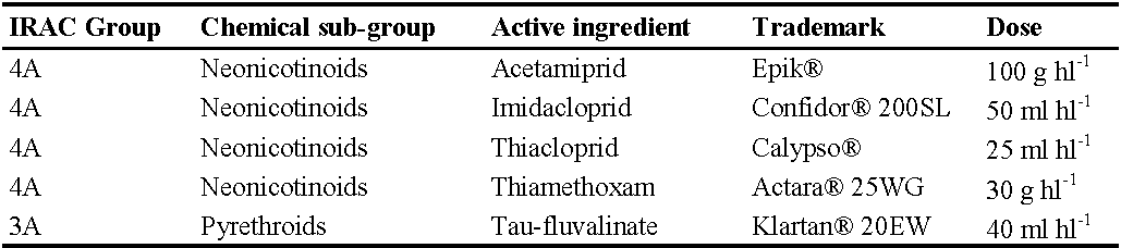 The effects of insecticides on A. andersoni populations were evaluated in an apple orchard located at the experimental station of E. Mach Foundation (FEM, S. Michele all′Adige, Trento, Italy) in the 2009 growing season. Five insecticides commonly applied in apple orchards were considered (Table 1). An untreated control was included for comparison.