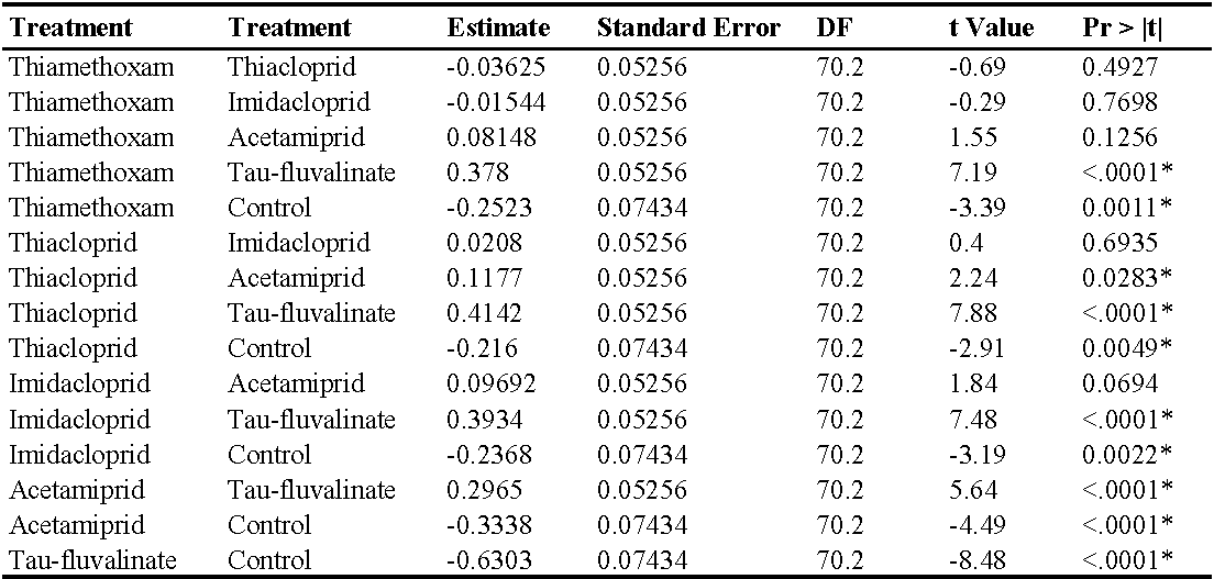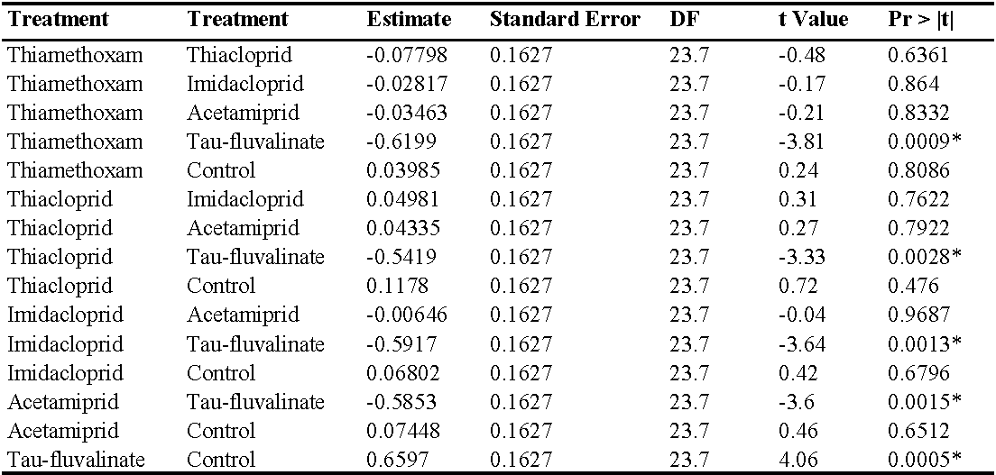 Table 3. Results of pairwise t-test (α = 0.05) to the least-square means with the Tukey’s adjustment performed on Amblyseius andersoni densities observed in treatments receiving two insecticide applications. Asterisks (*) indicate significant differences between treatments (α = 0.05).