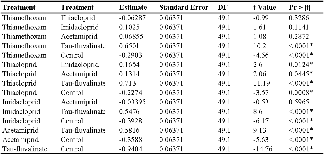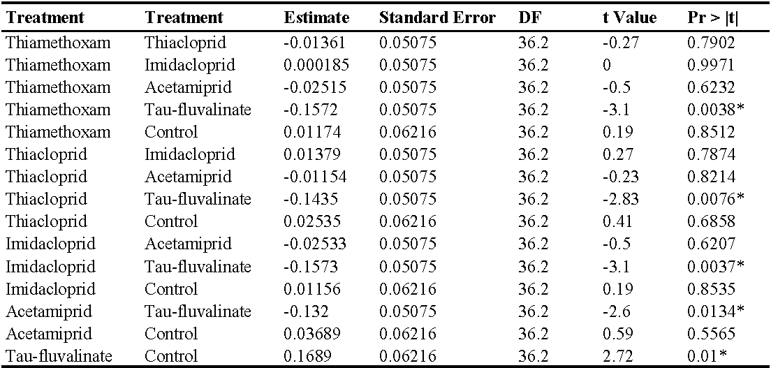 Table 5. Results of pairwise t-test (α = 0.05) to the least-square means with the Tukey’s adjustment performed on Amblyseius andersoni densities observed in treatments receiving three insecticide applications. Asterisks (*) indicate significant differences between treatments (α = 0.05).