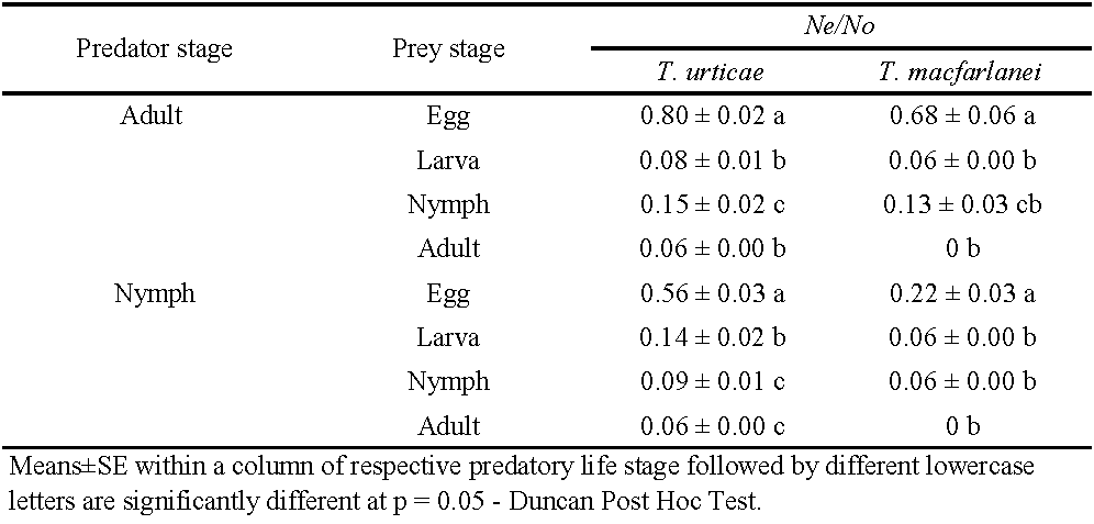 Results recorded a significant variation in the rate of feeding of the nymphal stages of N. longispinosus on different stages of T. urticae. The feeding preference decreased in the order of Egg> Larva > Nymph> Adult (Table 1) as the mean consumption rates were 56.6, 14.6, 9.5, and 6.6% respectively (F = 90.3; d.f = 3; p = 0.000). Similarly, the nymphal stages of the predator devoured significantly higher number of T. macfarlanei eggs and the rates of prey consumption on egg, larvae and nymphal stages of the prey mite were 22.6, 6.6, and 6.6% respectively (F = 33.2; d.f = 3; p = 0.000).