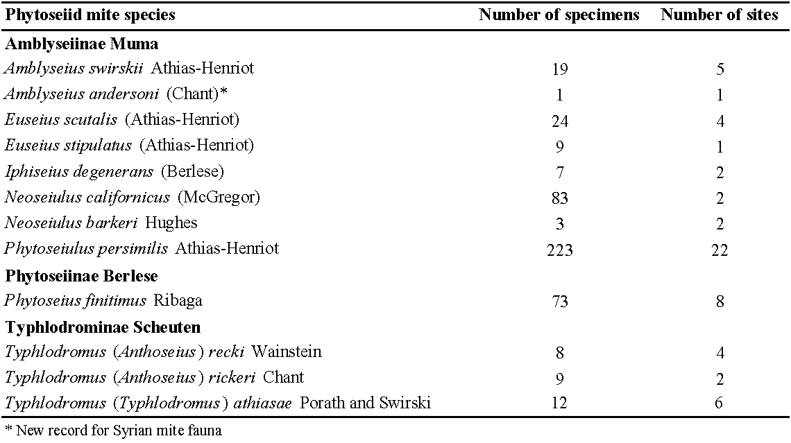 This study documents the occurrence of 12 phytoseiid species on solanaceous plants in the Syrian coastal region, among which 5 are recorded for the first time in Tartus governorate: Euseius stipulatus (Athias-Henriot), P. persimilis, N. barkeri, N. californicus and T. (A.) recki. One phytoseiid species, (Typhlodromus (Anthoseius) rickeri Chant), was never reported on Solanaceae before, while A. andersoni is a new record for the Syrian phytoseiid fauna, as its previous citations in Syria referred to misidentifications of A. swirskii, according to Barbar et al. (2022). The latter two species are very similar, but can be distinguished by a few morphological characteristics, as the considerably longer seta Z5 and macrosetae SgeIV and StiIV, and the u-shaped spermathecal calyx in A. andersoni, as opposed to the v-shaped calyx in A. swirskii (Ferragut et al. 2010; Döker et al. 2020).