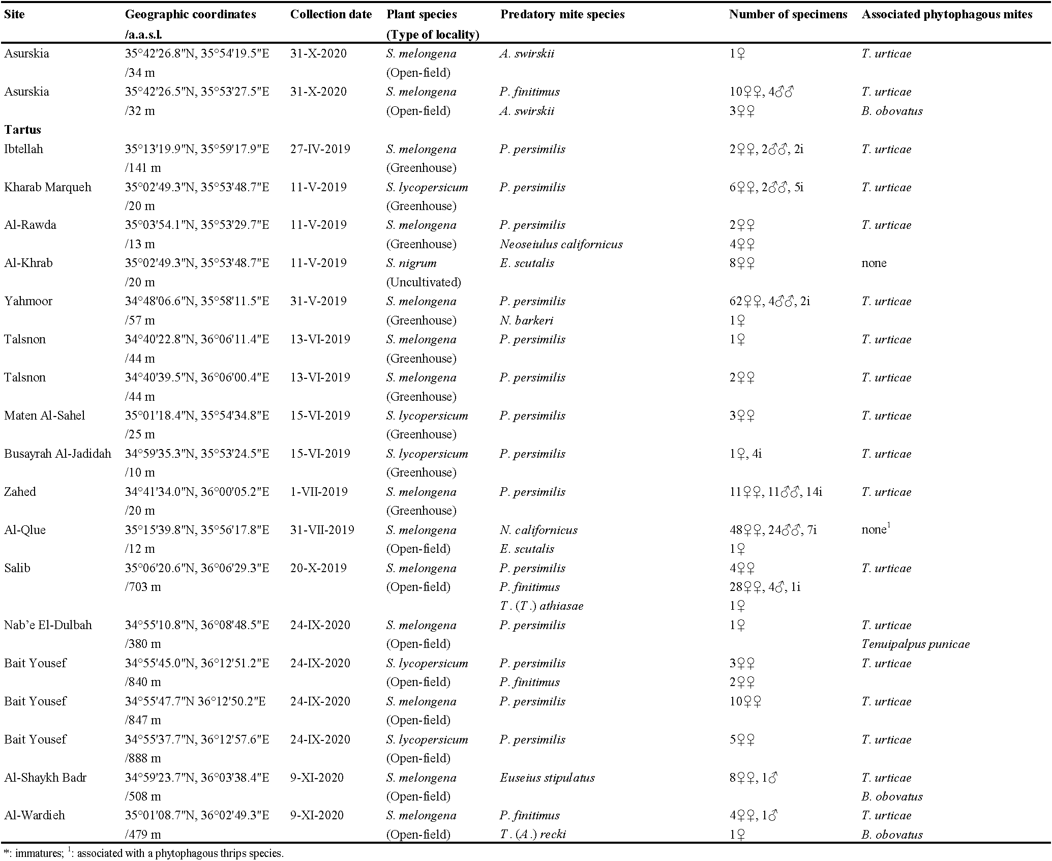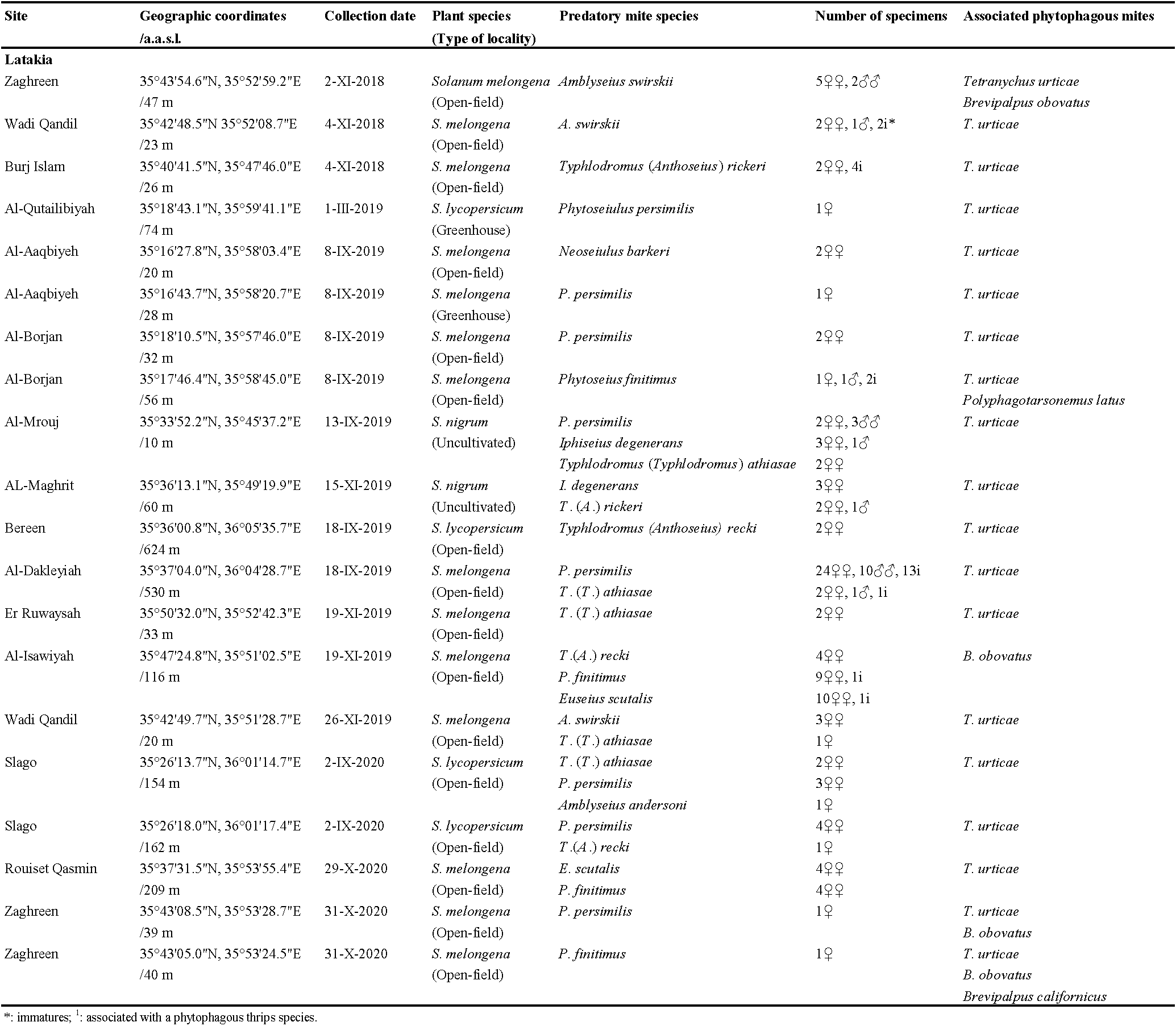 The Syrian coastal region, which includes Latakia and Tartus governorates, produces more than a third of the total national production of tomato and eggplant under both open-field and protected conditions (AASA 2020). Surveys were conducted in this region between 2018 and 2020 to identify the natural enemies of phytophagous mites on solanaceous plants. Five phytoseiid species have been reported in association with T. evansi on cultivated and wild solanaceous plants (Dayoub et al. 2022). In this study, we present additional records of phytoseiid mites found in association with other phytophagous mites on solanaceous plants in the Syrian coastal region.