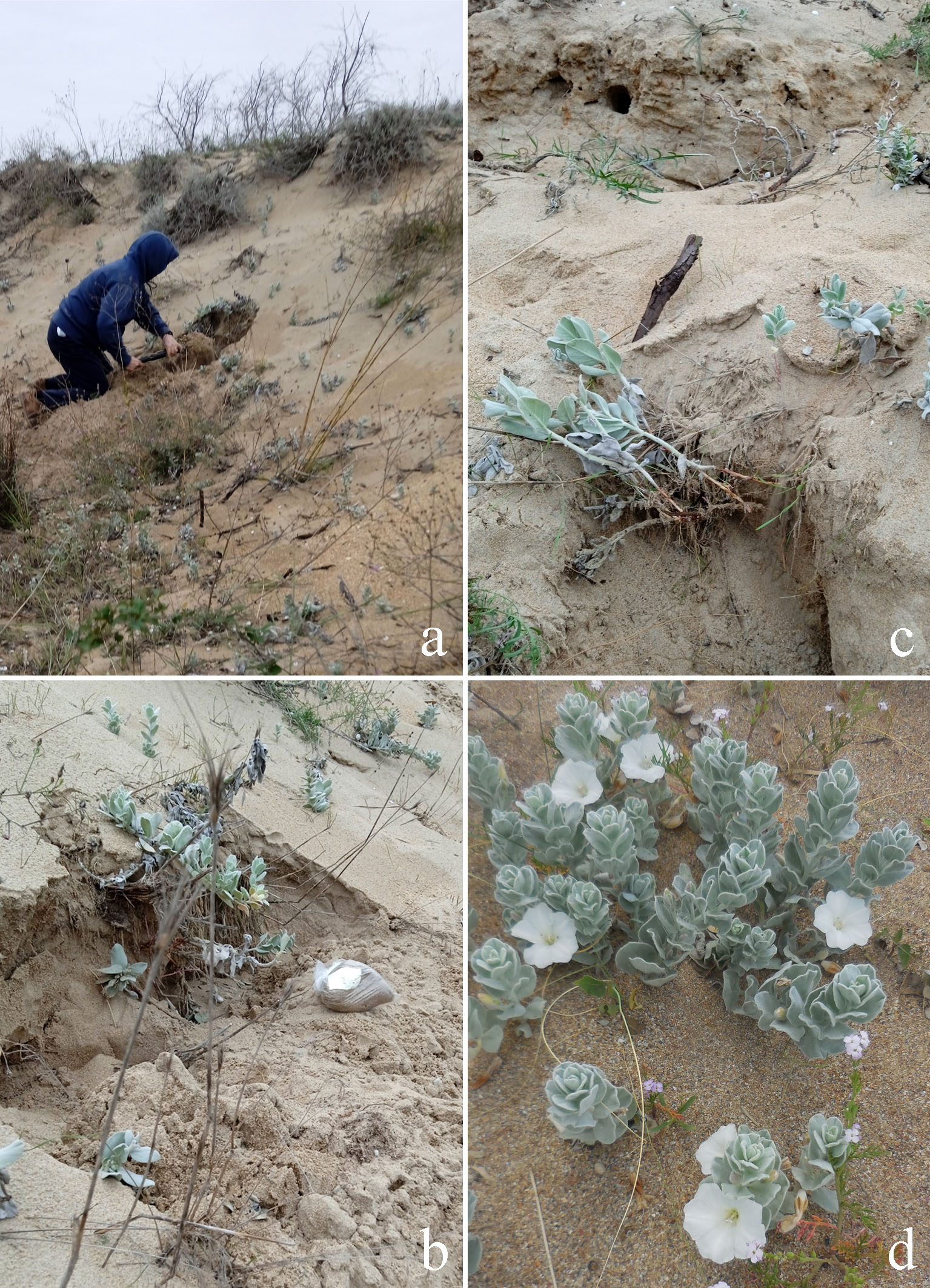 Mites were found on the slope of the small sand drift (Fig. 1a) formed on the flat sandy beach of the Caspian Sea at the distance of 300 m from the shore line. The vegetation of small dune (two samples) and adjacent plane sandy surface (three samples) was dominated by the bindweed, Convolvulus persicus L. (Fig. 1d). Numerous individuals (231) of D. (C.) cylindrica were found only in two samples from the hill slope (Fig. 1b, c).