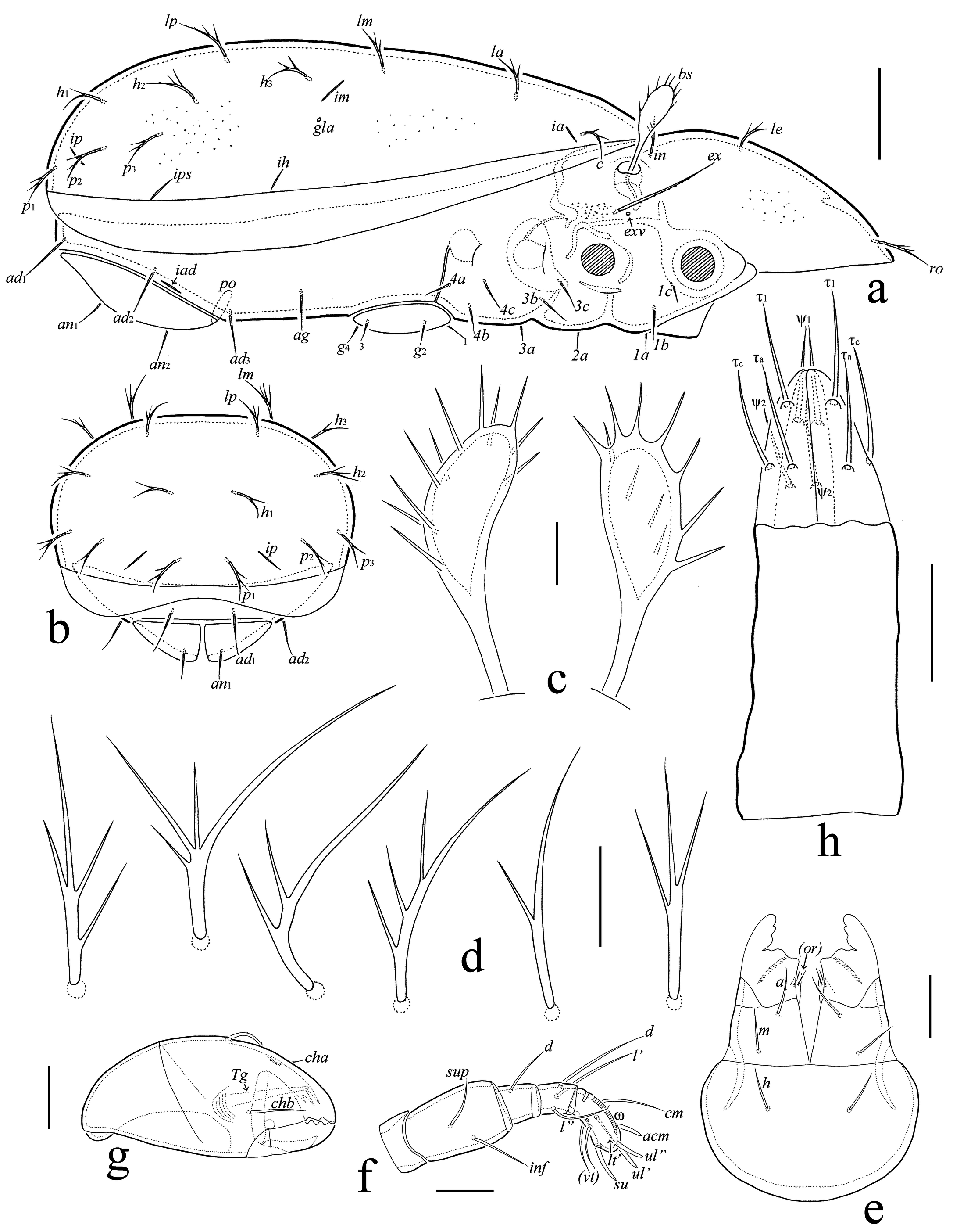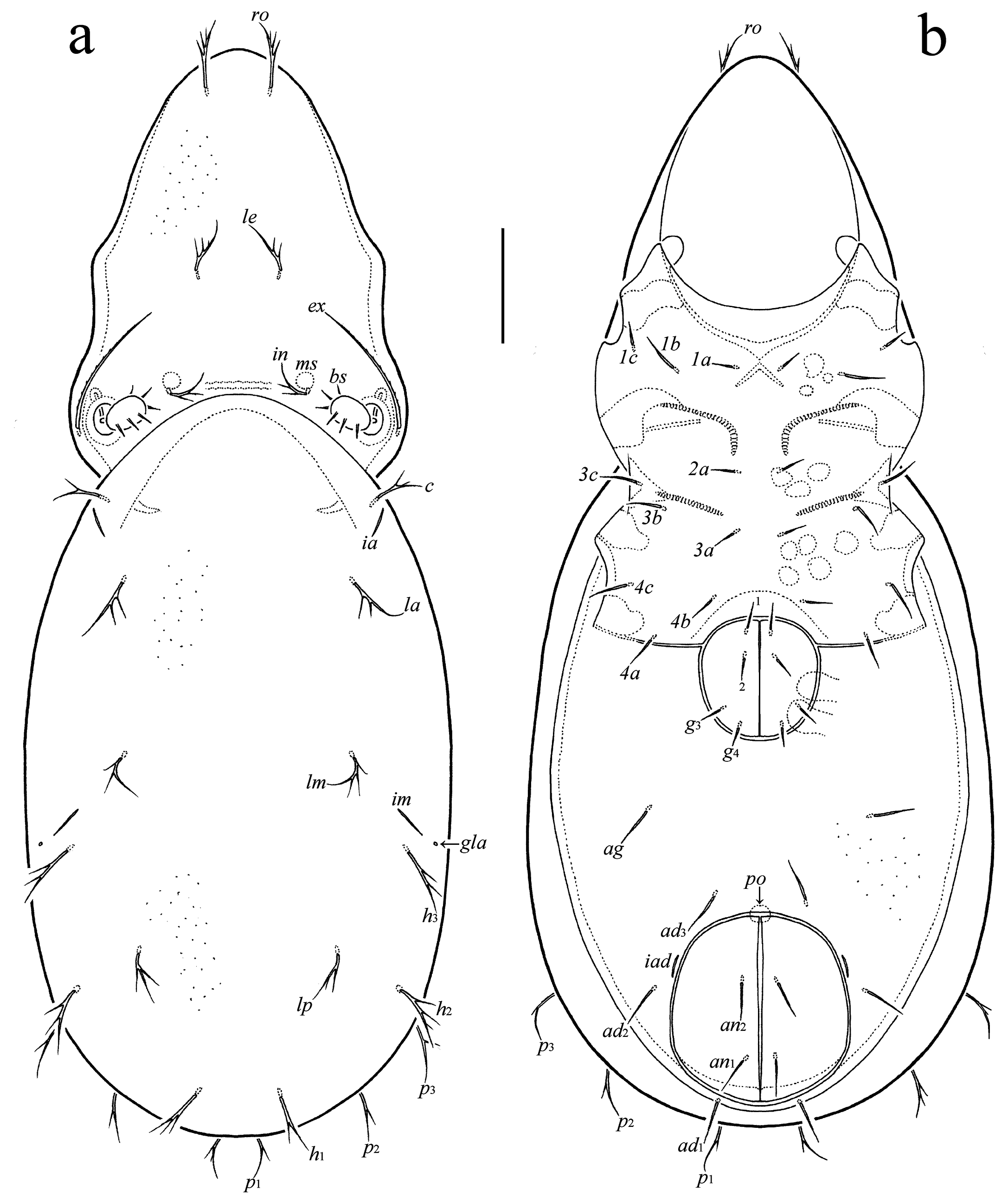 Prodorsum: ro, le, in, bs, ex = rostral, lamellar, interlamellar, bothridial, and exobothridial seta, respectively; exv = vestige of second exobothridial seta; ms = muscle sigillum. Notogaster: c, la, lm, lp, h, p = setae; ia, im, ip, ih, ips = lyrifissures; gla = opisthonotal gland opening. Gnathosoma: a, m, h = subcapitular setae; or = adoral seta; sup, inf, d, l, cm, acm, ul, su, vt = palp setae; ω = palp solenidion; cha, chb = cheliceral setae; Tg = Trägårdh's organ. Epimeral region: 1a–1c, 2a, 3a–3c, 4a–4c = epimeral setae. Anogenital region: g, ag, an, ad = genital, aggenital, anal, and adanal seta, respectively; iad = adanal lyrifissure; ψ, τ = setae of ovipositor; po = preanal organ. Legs: Tr, Fe, Ge, Ti, Ta = trochanter, femur, genu, tibia, and tarsus, respectively; ω, φ, σ = solenidia; ɛ = famulus; d, l, v, bv, ev, ft, tc, it, p, u, a, s, pv, pl = setae.