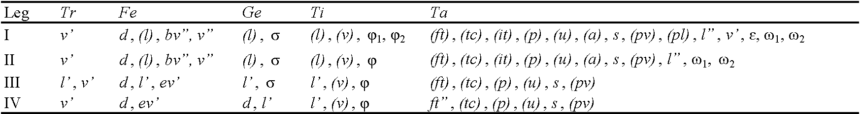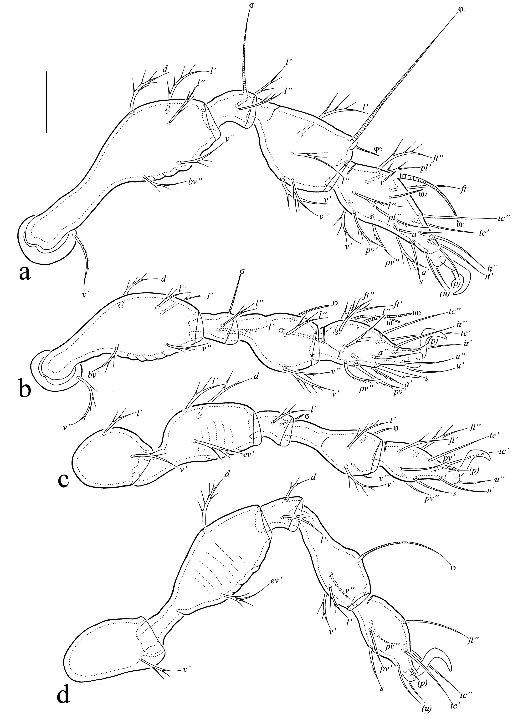 Legs (Figs 4a–4d) – Claw of each leg with slight barb on dorsal side. Porose area on all segments not observed. Formulas of leg setation and solenidia: I (1–5–2–4–20) [1–2–2], II (1–5–2–4–16) [1–1–2], III (2–3–1–3–11) [1–1–0], IV (1–2–2–3–10) [0–1–0]; homology of setae and solenidia indicated in Table 1. Setae p′ and p″ setiform on tarsus I versus very short, spiniform on tarsi II–IV; famulus short, rod-like, located laterally to solenidion ω1; seta s eupathidial on tarsus I; setae a′, a″, it′, and it″ absent on tarsus III, a′ and a″ absent on tarsus IV; many setae on segments branched; solenidia ω1 and ω2 on tarsi I and II, φ2 on tibia I, φ on tibiae II and III, and σ on genua II and III short or medium-sized, slightly or distinctly bacilliform; solenidia φ1 on tibia I, σ on genu I and φ on tibia IV long, subflagellate.