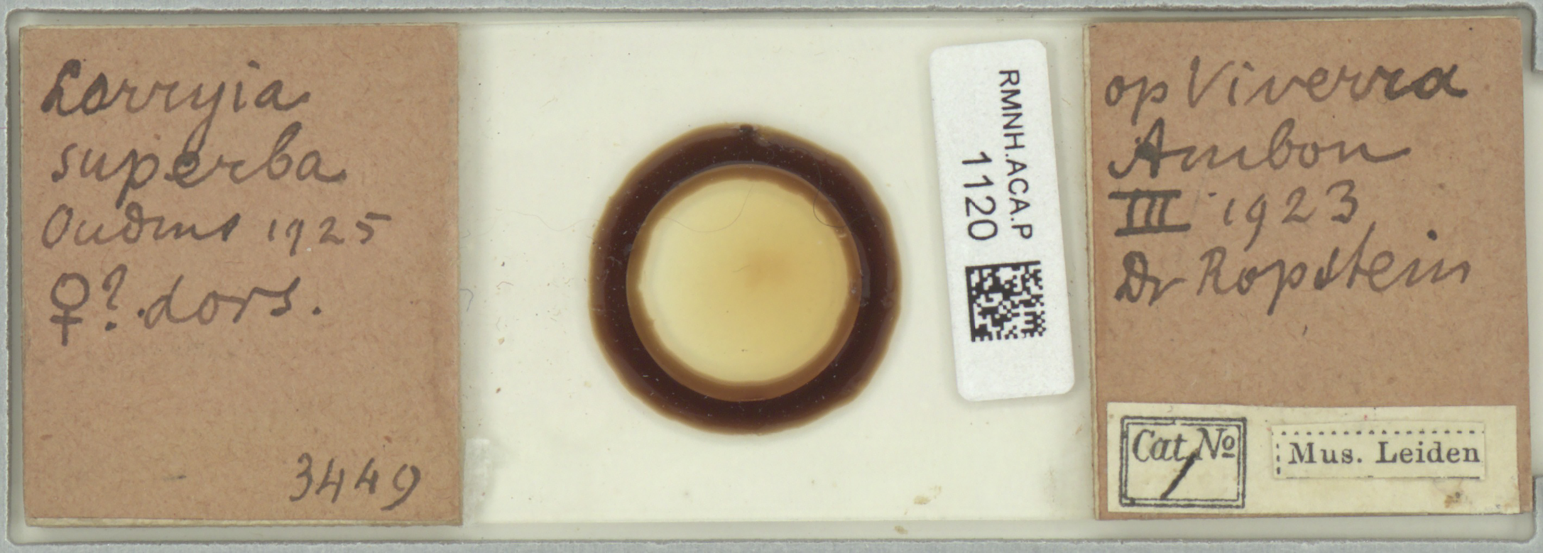 Lorryia superba, the type species of the genus, is represented by a unique specimen. This type, not seen by Baker (1968: 986), was supposed to be lost (Kaźmierski, 1998: 301; André, 2005: 994; Silva et al., 2016a: 4). According to Buitendijk (1945: 323), this type was represented only by drawings but the slide is displayed on line by the Naturalis Biodiversity Center, Leiden, The Netherlands (slide RMNH.ACA.P.1120).