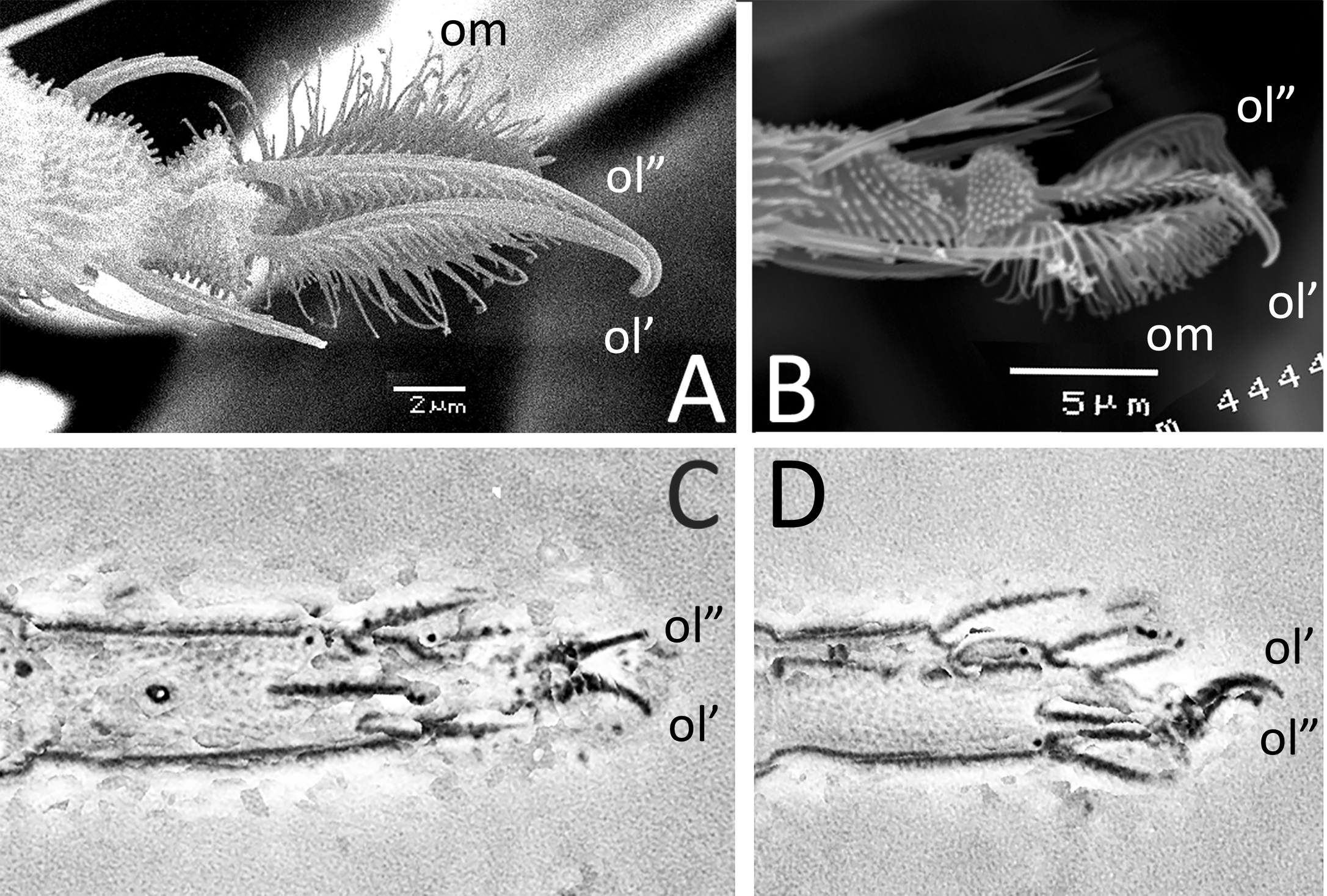 Bidactyly also can be artificial and result from inadequate manipulations. This is probably the case of the SEM micrograph of B. sibiriensis published by Khaustov (2023, his fig. 6D). According to Khaustov (mail 07-05-2023), the specimen became fragile after preparation, the empodium inserted in ventral position (figure 4A, B) is broken and missing and the scar resulting from the fracture is hidden by the apex terminating the apotele.