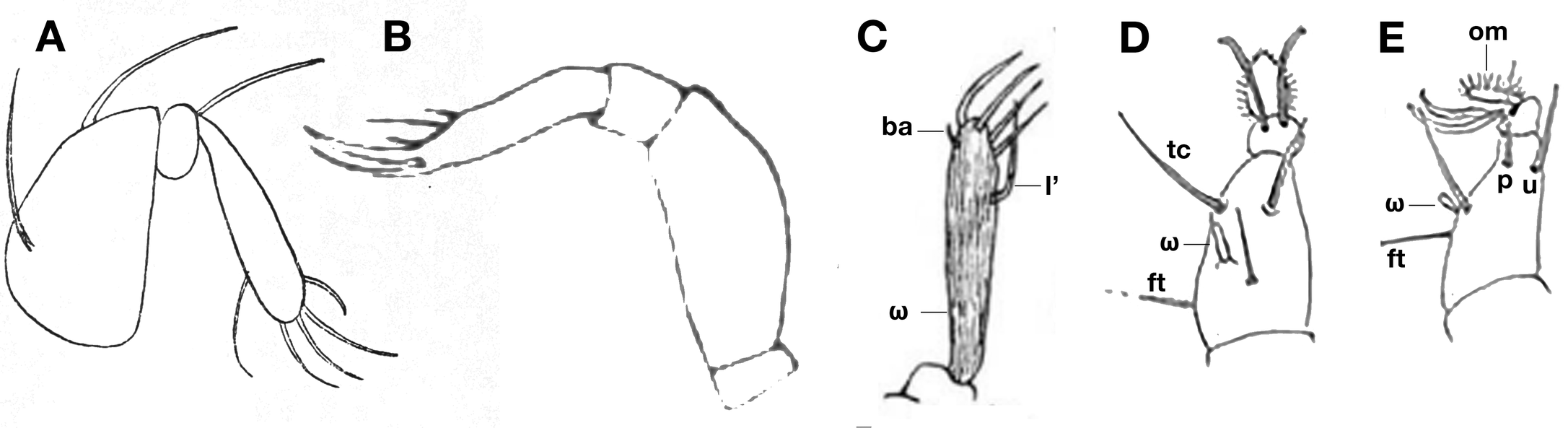 The original description was therefore revisited in light of modern ideas, for example the dactyly, even if some ideas and concepts were unknown to Oudemans, for example the phanerotaxy (chaetotaxy and solenidiotaxy). This approach is completed by some of Oudemans' plates which have not been published but were listed in the catalog of Buitendijk (1945) and are available on the net (see Wikispecies pages), courtesy of the Naturalis Biodiversity Center. Moreover, Oudemans' drawings reproduced by Thor (1933) were also studied.