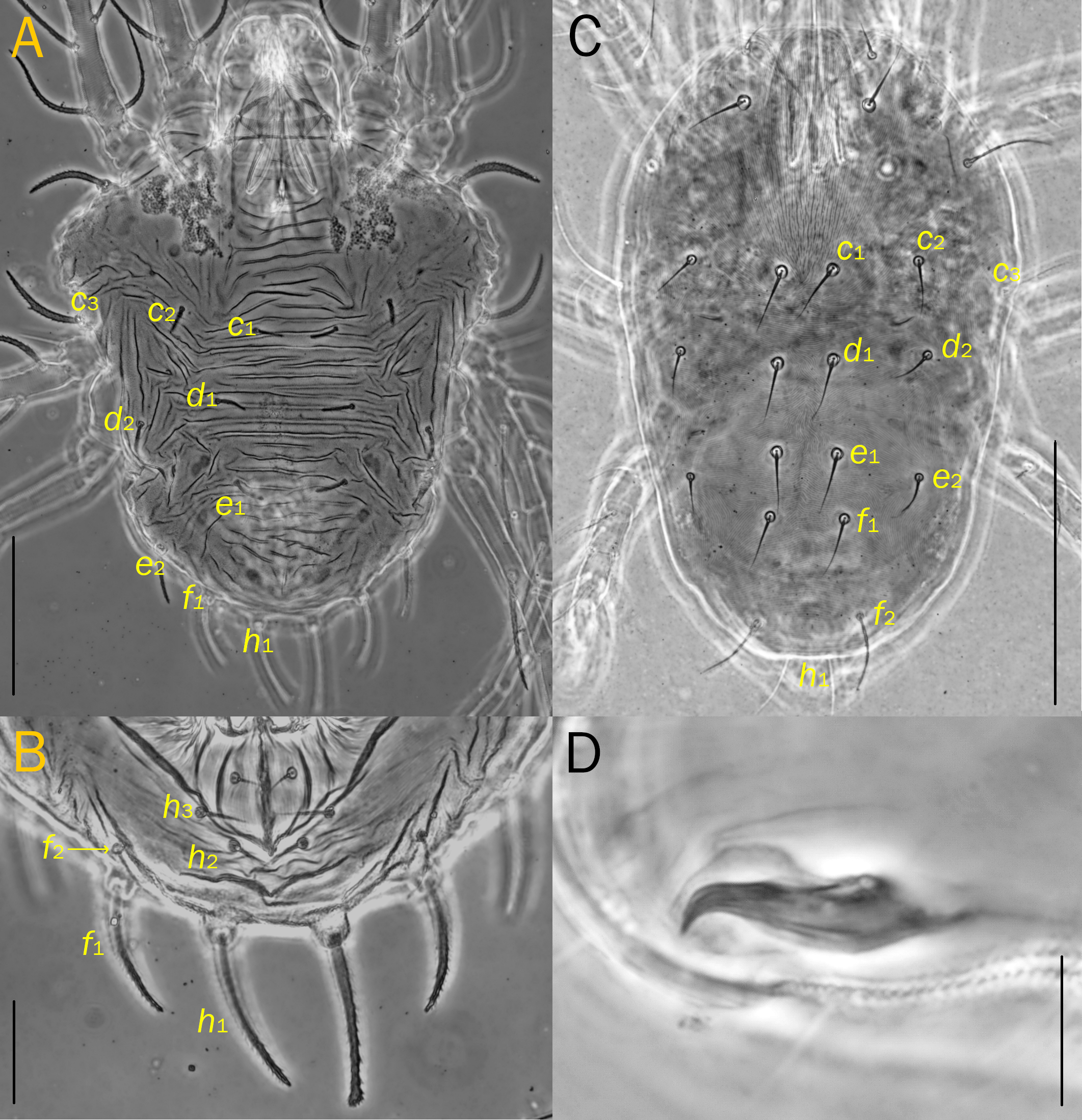 Distinctive characters (Fig. 1A, B): females of this species are readily distinguished by their lateral expansions of the propodosoma, by the ventral position of outer sacrals setae (f2), setae f2 being half as long as setae f1, setae sc1, c1, c2, d1, e1 being subequal in length and setae h1 being longer than setae f1.