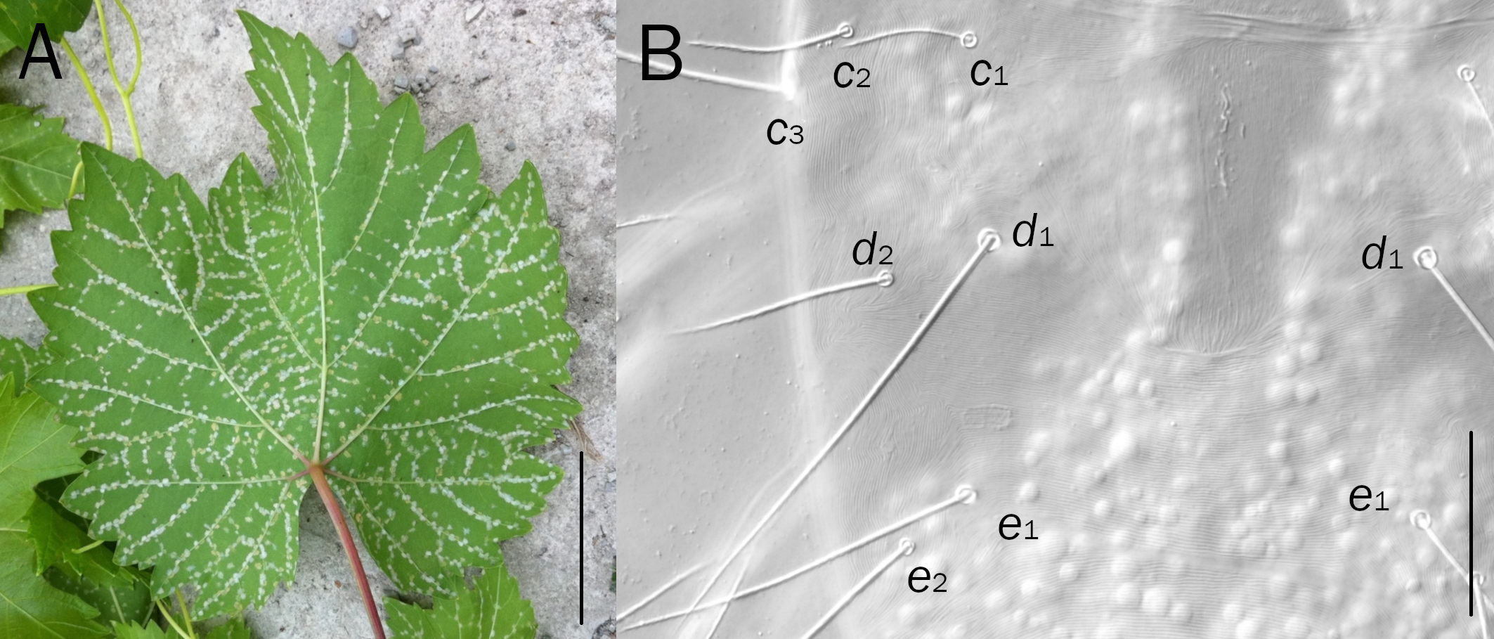 All the specimens of O. perseae were collected on avocado, P. americana, on the French Côte d'Azur, at Menton, near the Italian border. The first sample came from the private garden of Dr René d'Agro who sent us a sample of mite from infested avocado leaves. He also sent some pictures of grapevine leaves, Vitis vinifera L. (Vitaceae), from his neighbor's garden near his own, which were infested by a spider mite whose leaf symptoms were similar (silk nests on the underside of leaves, mainly located along the midrib and main veins) to those produced by O. perseae (Fig. 2A). Although we did not observe under the microscope the mites responsible for these symptoms on grape (we did not have the opportunity to collect mite material because the owner wished to remain anonymous), we also believe that the mite responsible for this damage is O. perseae. However, this possible occurrence of O. perseae will be the third record of this species on grapevine. The first report was in Madeira Island and the second in Algarve, Portugal mainland (Ferreira et al. 2006, 2007). A second sample was collected in the botanical garden of Menton and other avocado trees showing symptoms of infestation by O. perseae were also observed [not collected: as the symptoms observed were typical of O. persae (see above), we did not consider it necessary to expand the number of samples] here and there in the city.