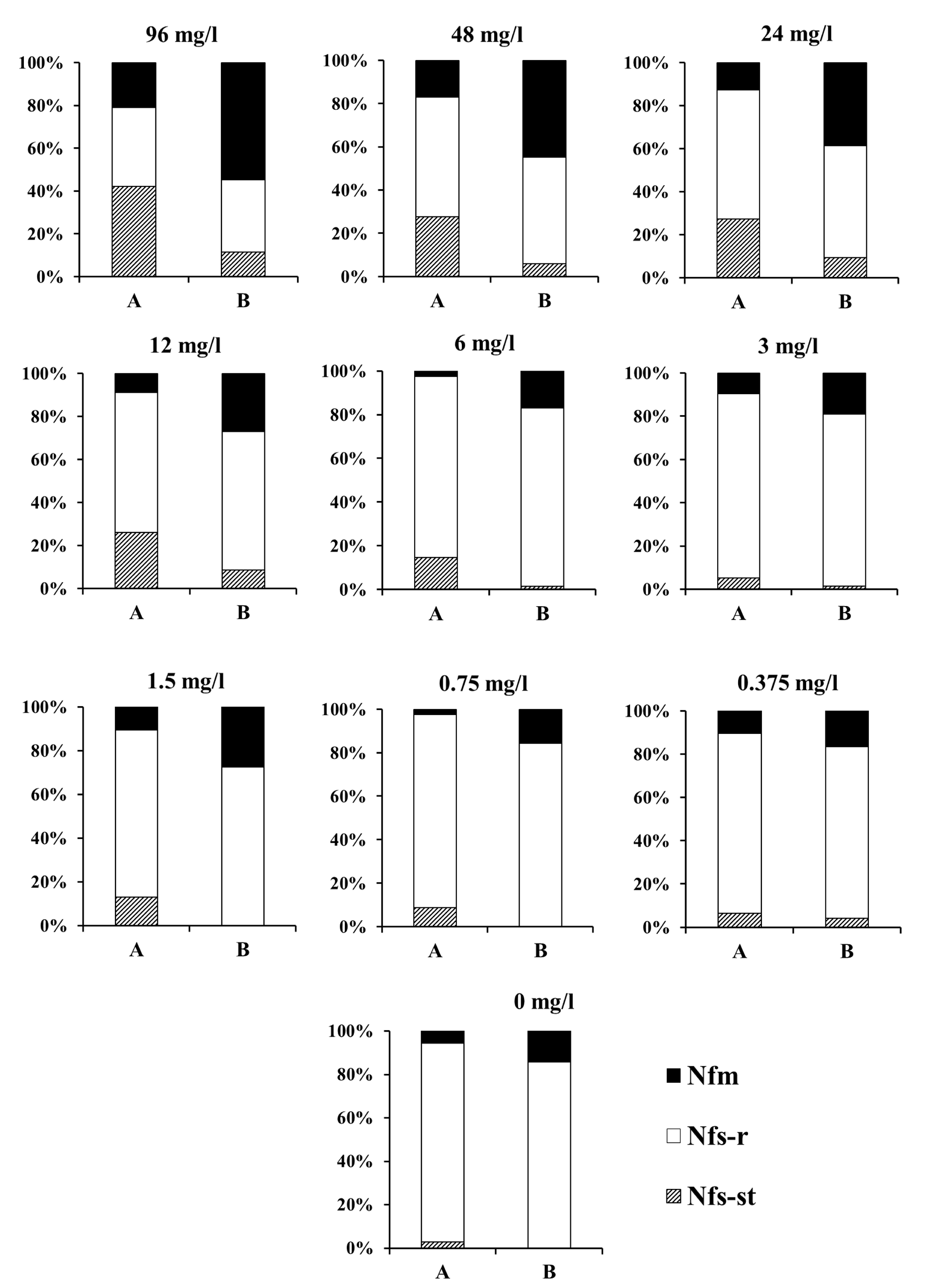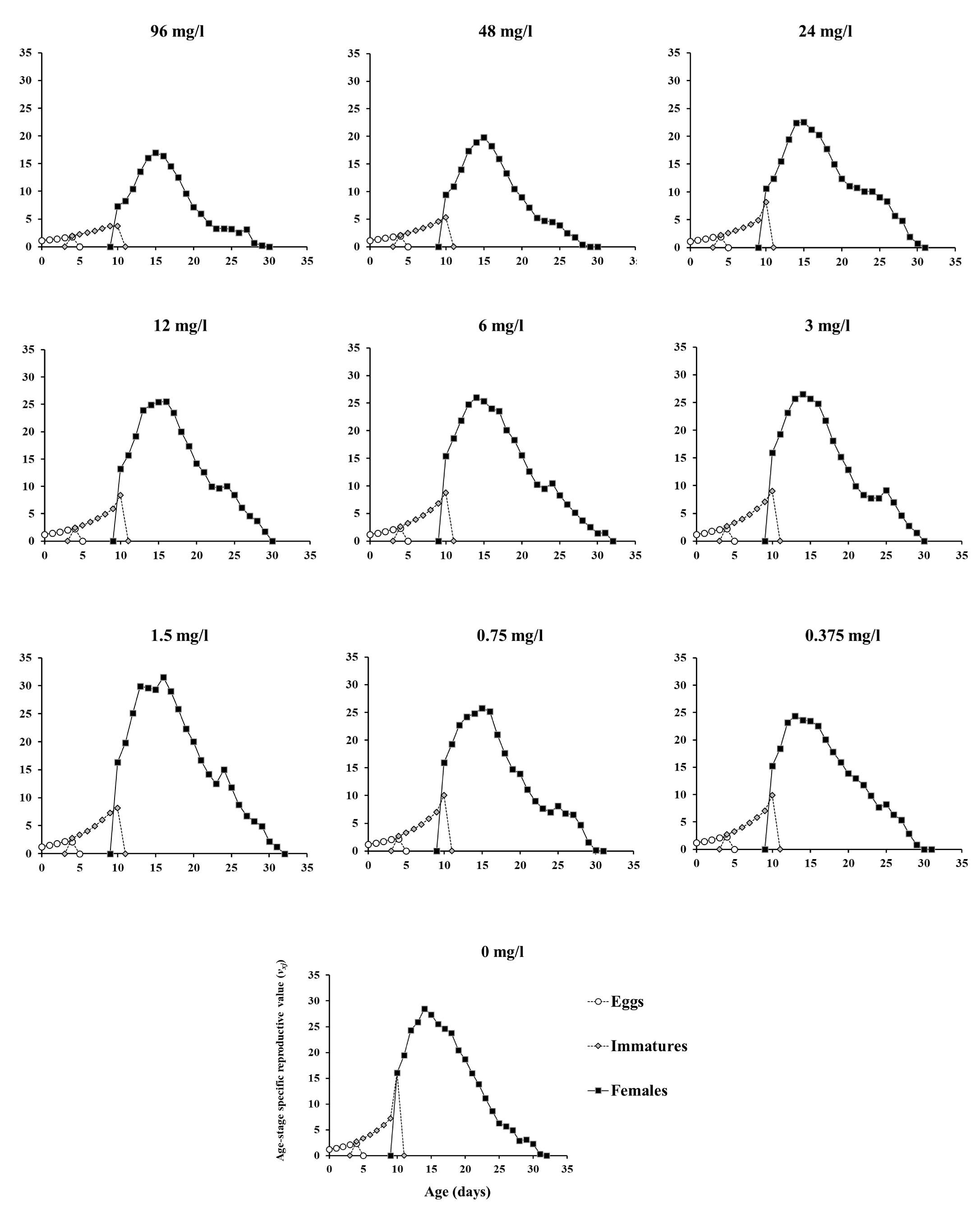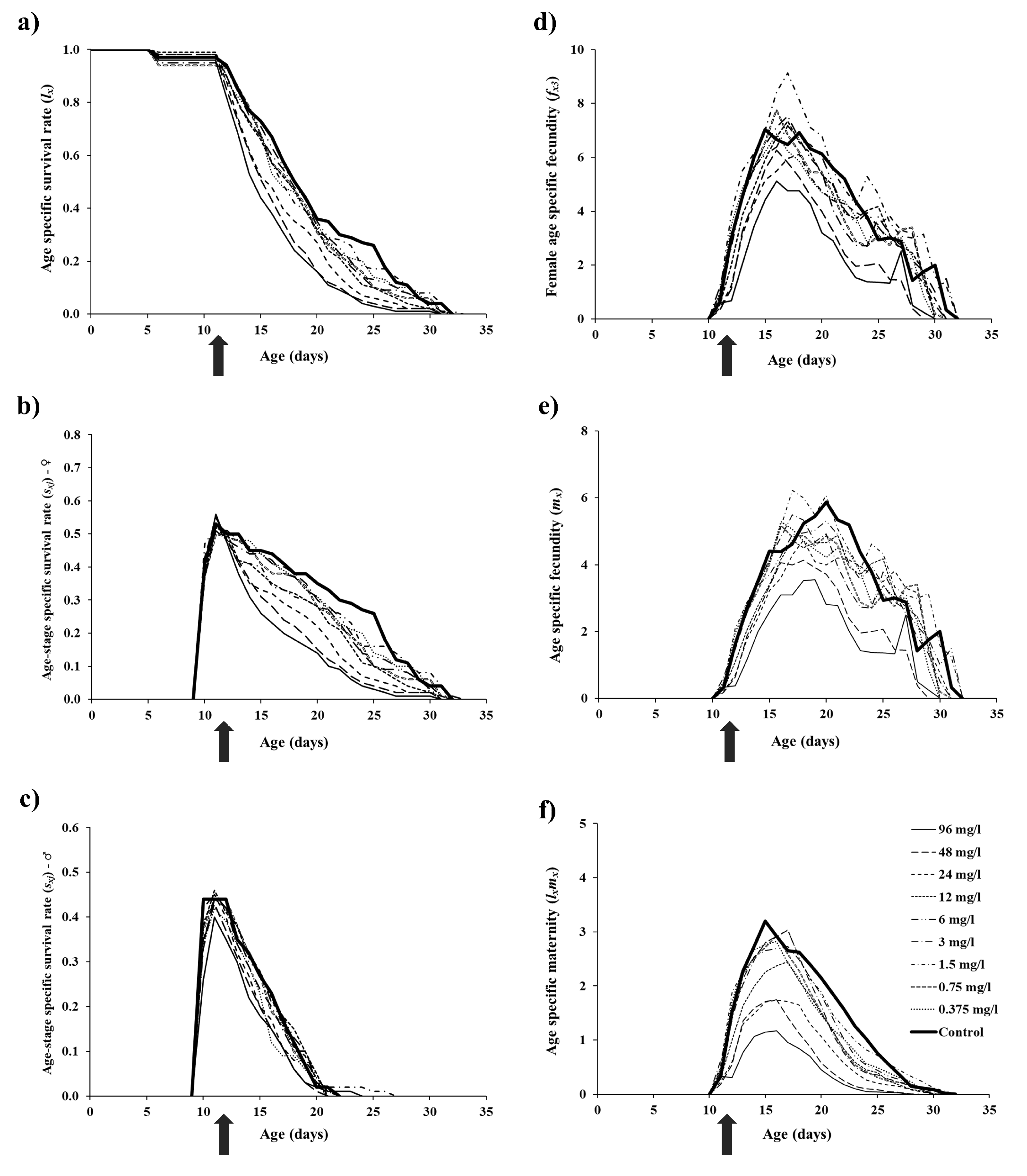Demographic parameters are detailed in Table 3. The net reproductive rate (R0), intrinsic rate of increase (r) and finite rate of increase (λ) were significantly reduced by the three highest concentrations (by 49-72%, 20-34%, and 4-6%, respectively), compared to the control. In treatments with 96 mg/l concentration, these three demographic parameters were significantly lower also in comparison with treatments with concentrations of 48 mg/l and 24 mg/l. The gross reproductive rate (GRR) was significantly reduced by treatments with concentrations of 96 mg/l and 48 mg/l (by 39%, and 49%, respectively) compared to the control. As in the life history traits, the highest GRR value was found in treatment with 1.5 mg/l, but it was not significantly different from the control (Table 3).