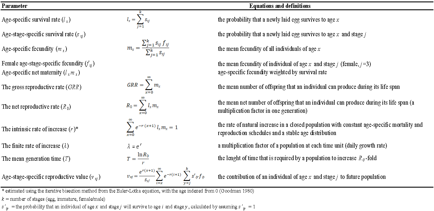 Raw life table data were analyzed according to the age-stage two-sex life table theory (Chi and Liu 1985; Chi 1988; Chi et al. 2020), using the software TWOSEX-MSChart (Chi 2021; Chi et al. 2022). Males obtained from the colony as well as escaped or drowned individuals were excluded from the analysis. The life table data included the number of eggs laid (fecundity-based life table) or the number of viable eggs (fertility-based life table). The demographic parameters are detailed in Table 1. Standard errors of the life-history traits and demographic parameters were estimated by the bootstrap technique with 50,000 bootstrap replicates. Differences between control and treatment were compared by the paired bootstrap test (50,000 replicates) based on the confidence interval of difference (Efron and Tibshirani 1993; Chi et al. 2020, 2022).