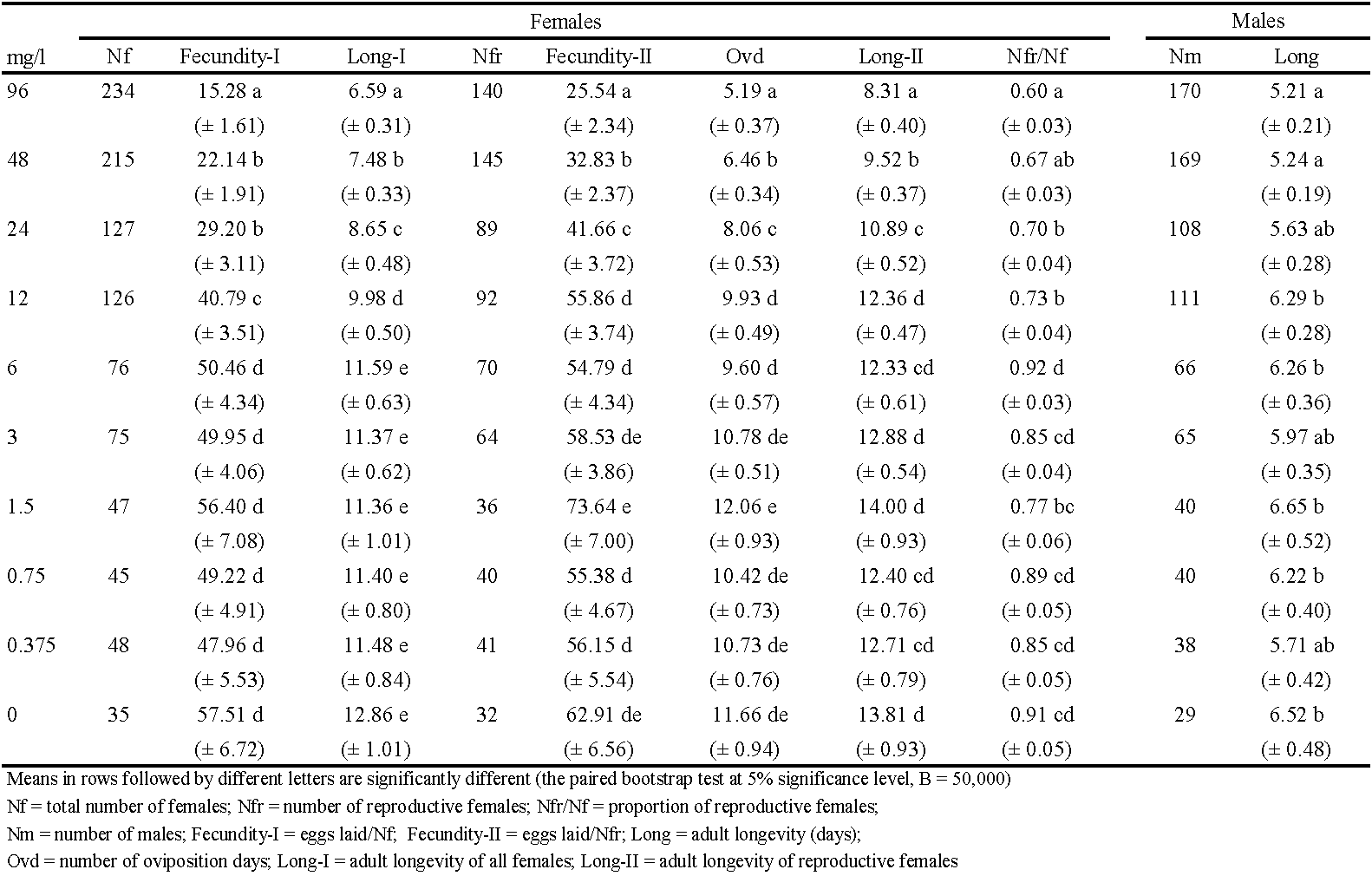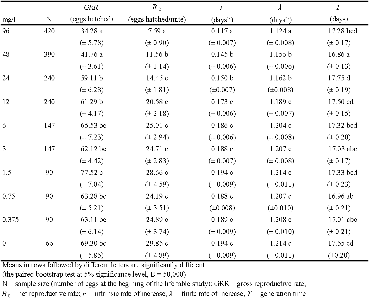 Demographic parameters obtained from fertility-based life tables are detailed in Table 5. Spirodiclofen concentration that significantly reduced fertility-II (24 – 96 mg/l) also decreased r and λ significantly (by 23-40%, and 4-7%, respectively) compared to the control. The concentrations 96 mg/l and 48 mg/l significantly reduced GRR (by 50% and 40%, respectively) and R0 (by 75% and 61%, respectively), compared to the control. The highest GRR value was recorded after treatment with 1.5 mg/l, but this value was not significantly different from the control (Table 5). All these parameters were lower than those acquired from fecundity-based life tables but the differences had no statistical significance (the paired bootstrap test at 5% significance level, B = 50,000).