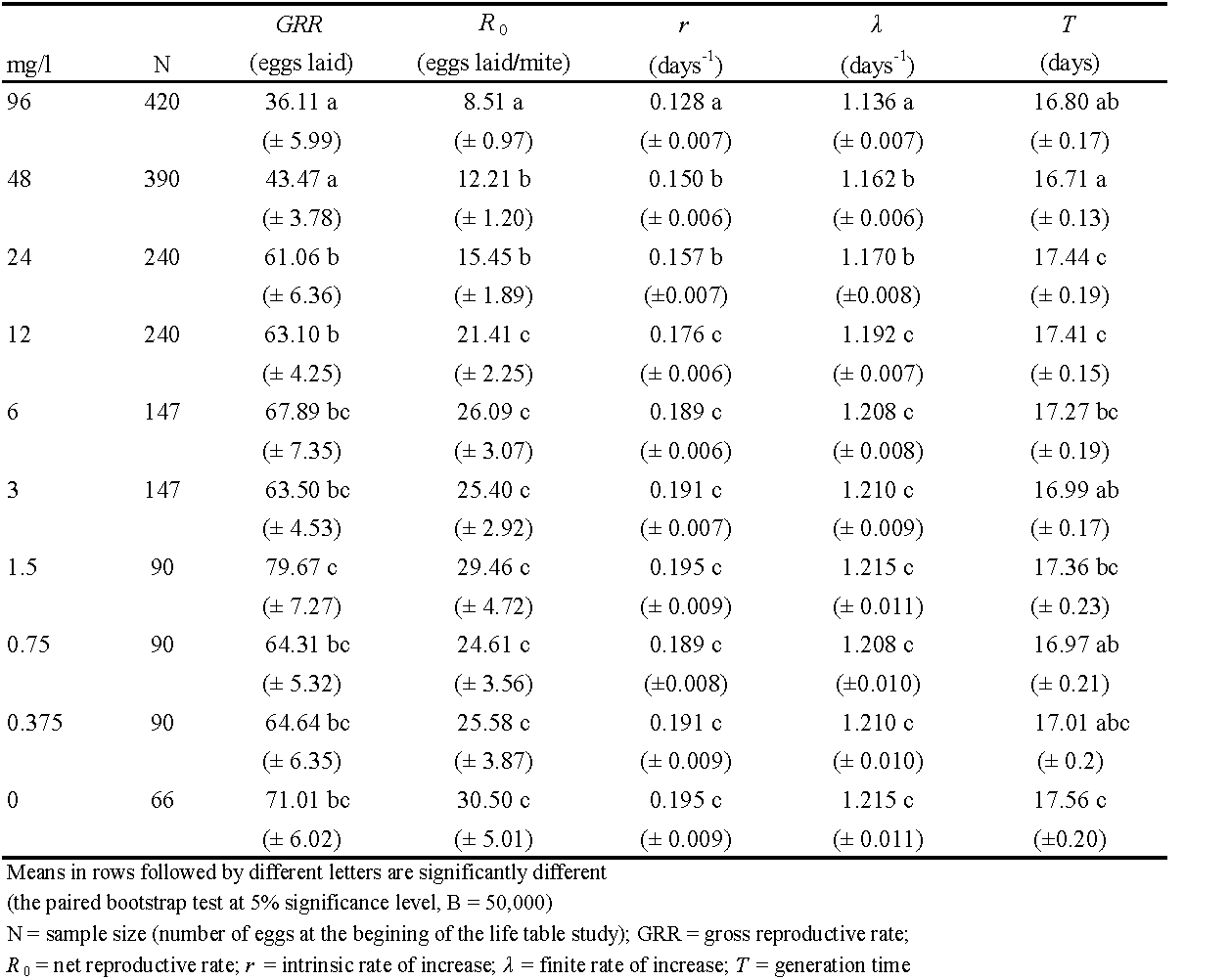 https://doi.org/10.24349/qvon-22miDemographic toxicological studies, based on the incorporation of life tables in the context of toxicology, have become an essential element in the laboratory evaluation of pesticide effects on insects and mites. This approach accounts both for the lethal and sublethal effects of pesticides/acaricides and integrates their impact at an ecologically more relevant level into population growth rate and other demographic parameters (Stark and Banks 2003; Guedes et al. 2016). The age-stage two-sex life table (Chi et al. 2020) has become a frequent tool lately in various subject areas of entomological and acarological research, including the evaluation of acaricide effects on plant-inhabiting mites (e.g. Musa et al. 2017, 2022; Bozhgani et al. 2019; Havasi et al. 2021; Rimy et al. 2021; Rajaee et al. 2022).