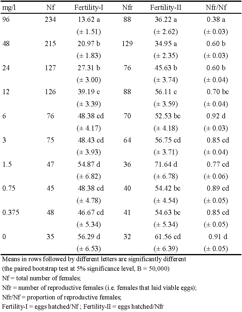 Compared to fecundity-I (Table 2), fertility-I was somewhat lower as maximum reduction was 11% in treatment with the highest concentration (Table 4). Fertility reduction was the consequence of two factors. The first factor was the residual toxic action of spirodiclofen on eggs laid on treated leaf discs during 24-h exposure. In treatments with concentrations of 3 - 96 mg/l, the percentage of unhatched eggs ranged between 17% and 98%, while it was less than 2% after treatments with concentrations of 0.375 – 1.5 mg/l and in the control. The second factor was transovarial toxic effect on eggs laid on untreated surface following the exposure, which was most evident in treatments with the three highest concentrations. However, this effect was short-lived: the percentage of unhatched eggs was 13- 32% on the first day, 8-20% on the second day, while it remained between 2% and 4% from the third day until the end of trial, which is similar to the other treatments and the control. Residual toxicity to eggs laid on treated discs was the primary contribution towards reduced proportion of reproductive females in treatments with concentrations of 12 – 96 mg/l. Resulting from the lower number of reproductive females (compared to fecundity-based life tables) fertility-II was higher than fecundity-II in those treatments.