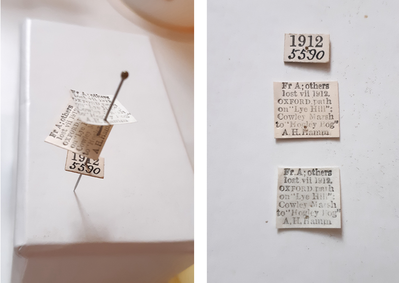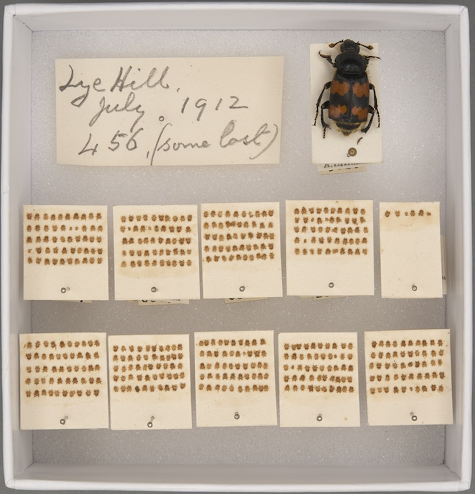 In 1912, insect collector A. H. Hamm found a specimen of Nicrophorus on Lye Hill, from Cowley Marsh towards Hogley Bog, in an area now known as the Lye Valley and Cowley Marsh Nature Reserves, Oxford (according to the labels, see Fig. 2). He removed the 456 plus mites from the single beetle, and painstakingly glued each of them to the cardboard mounts, preserving beetle and mites together (Fig. 1). Specimens have been carefully prepared and photographed, managing to preserve their integrity despite their morphological fragility.