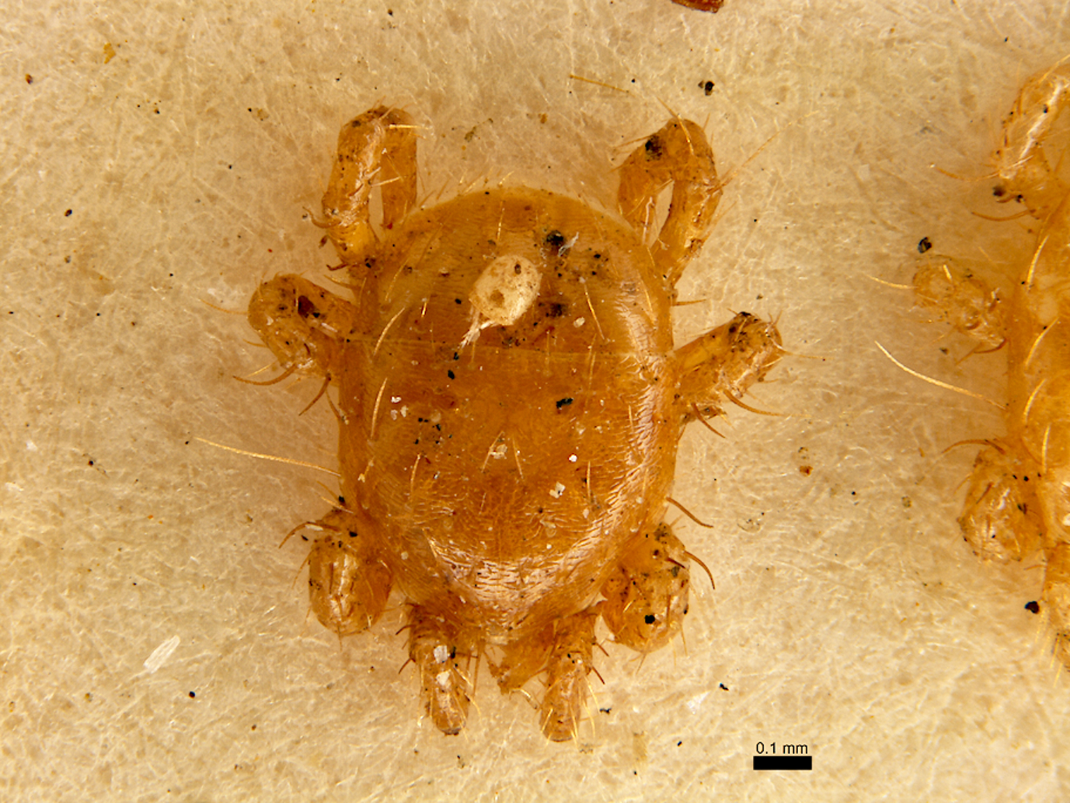 Figure 3. Hyperphoretic hypopus (Astigmatina: Histiostomatidae) attached to the dorsal shield of a Poecilochirus carabi (larger morphotype) specimen. Bar 100 µm.