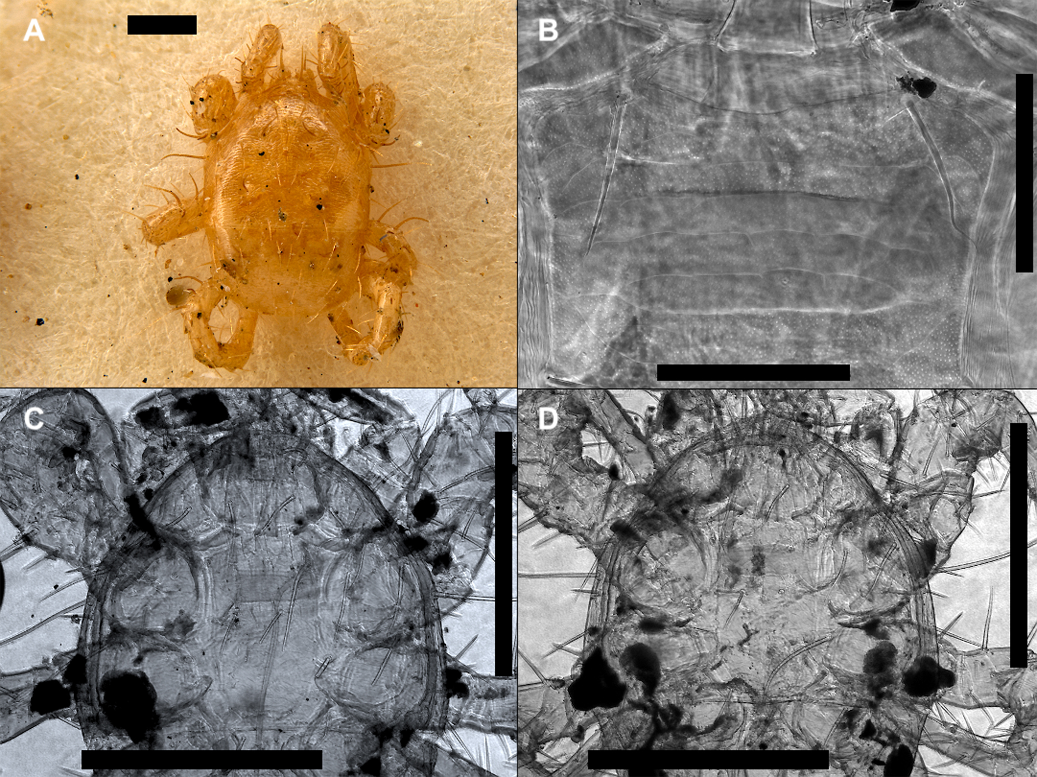 Figure 5. Macrocheles nataliae female on Nicrophorus vespillo. a – Stereo microscope photograph of M. nataliae glued to cardboard. b – Microphotograph (Phase contrast) of full body (ventral). c – Microphotograph (Phase contrast) of sternal shield (ventral). d – Microphotograph (Phase contrast) of ventrianal shield. Bars: A-200, B-200 and C-D-100 µm.