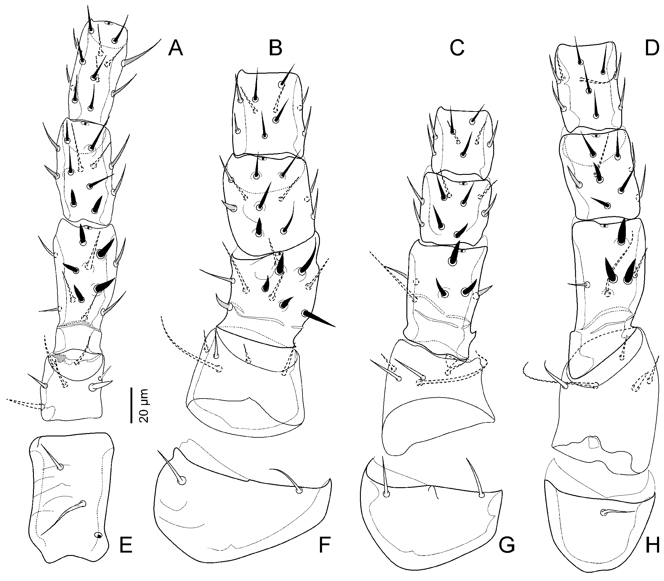 Legs — Female and male. Legs of moderate length, I and IV no longer than dorsal shield. Legs I slightly longest and thinner, and II slightly thicker, than legs III and IV (Figures 4A–D). Distal margins of coxae I–IV without serrated ridges or spur-like processes (Figures 4E–H). Legs I to IV with pretarsi bearing paired claws of moderate size, inconspicuous paradactyli, and rounded pulvilli (Figures 3A, E). Leg I tarsus with 45 setae (Figure 3B) and distinct pedicel bearing pretarsal structures (Figures 3A, C). Tarsus I with sensilla s inconspicuous, not noticeably lanceolate distally (Figure 3D). Legs II to IV with tarsus (excluding pretarsus) about twice as long as tibia. Tarsi II–IV with apical setal processes ad-1, pd-1 short, less than half as long as pretarsi (Figures 3E, F), and with rounded triangular apical process ventrally. Setation and their ontogeny on segments of legs I to IV with full complement of Ascidae (as presented by Lindquist and Evans 1965 for Ascini), coxae, 2-2-2-1; trochanters, 6-5-5-5; femora, 12 (2 3/1 2/2 2) –11 (2 3/1 2/2 1) – 6 (1 2/1 1/0 1) – 6 (1 2/1 1/0 1); genua, 13 (2 3/2 3/1 2) – 11 (2 3/1 2/1 2) – 9 (2 2/1 2/1 1) – 9 (2 2/1 3/0 1), genu IV lacking pv-1; tibiae, 13 (2 3/2 3/1 2) – 10 (2 2/1 2/1 2) – 8 (2 1/1 2/1 1) – 10 (2 1/1 3/1 2). Tarsi II–IV with seta ad-2 somewhat elongated but not extending to base of pretarsi (Figure 3E); paired ventral setae (v-1) and (v-2) somewhat spine-like and claws strong (Figure 3F); other leg setae simple, not strongly modified on female. Male leg setal dimorphism not notably developed (Westerboer, 1963).