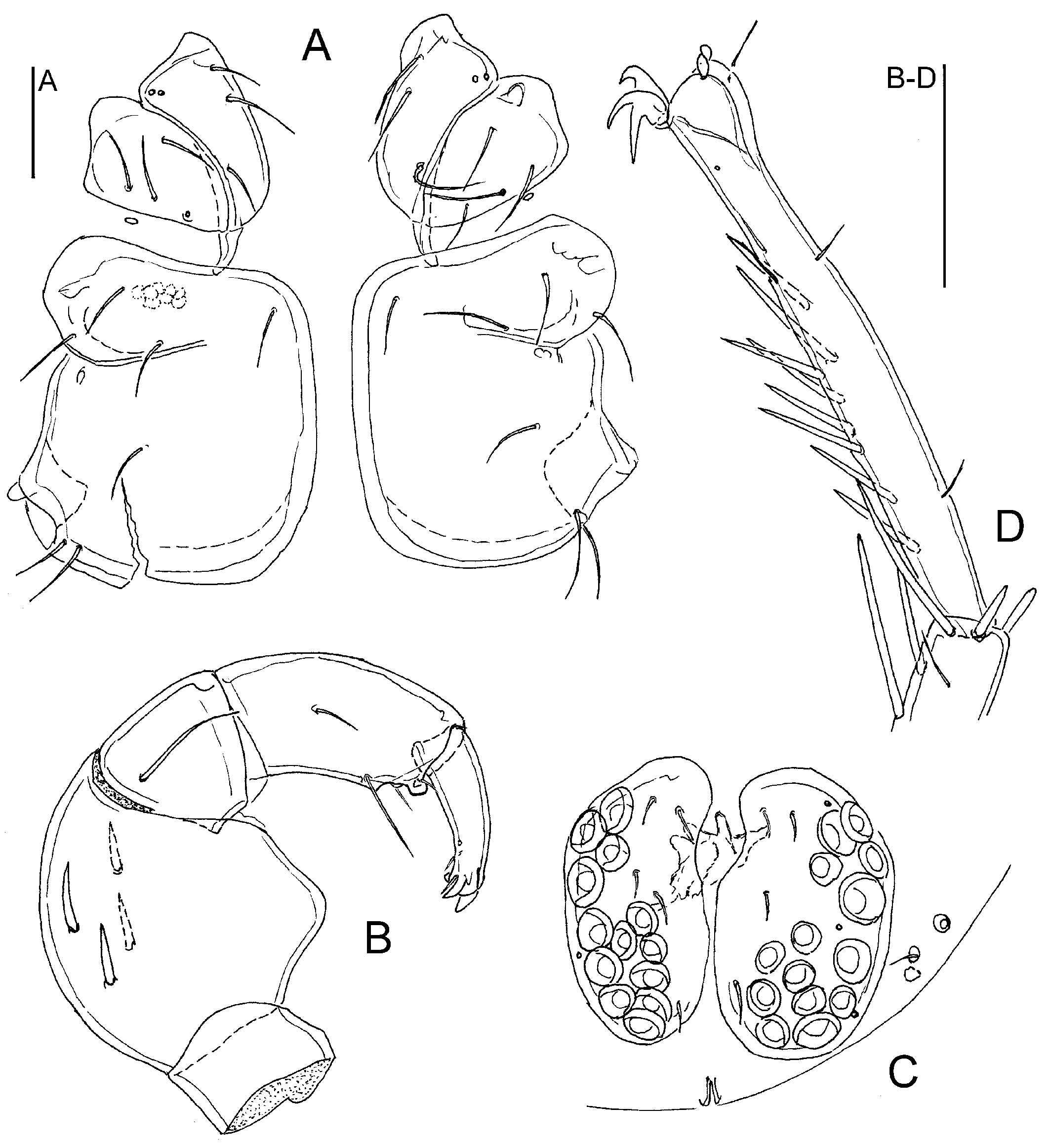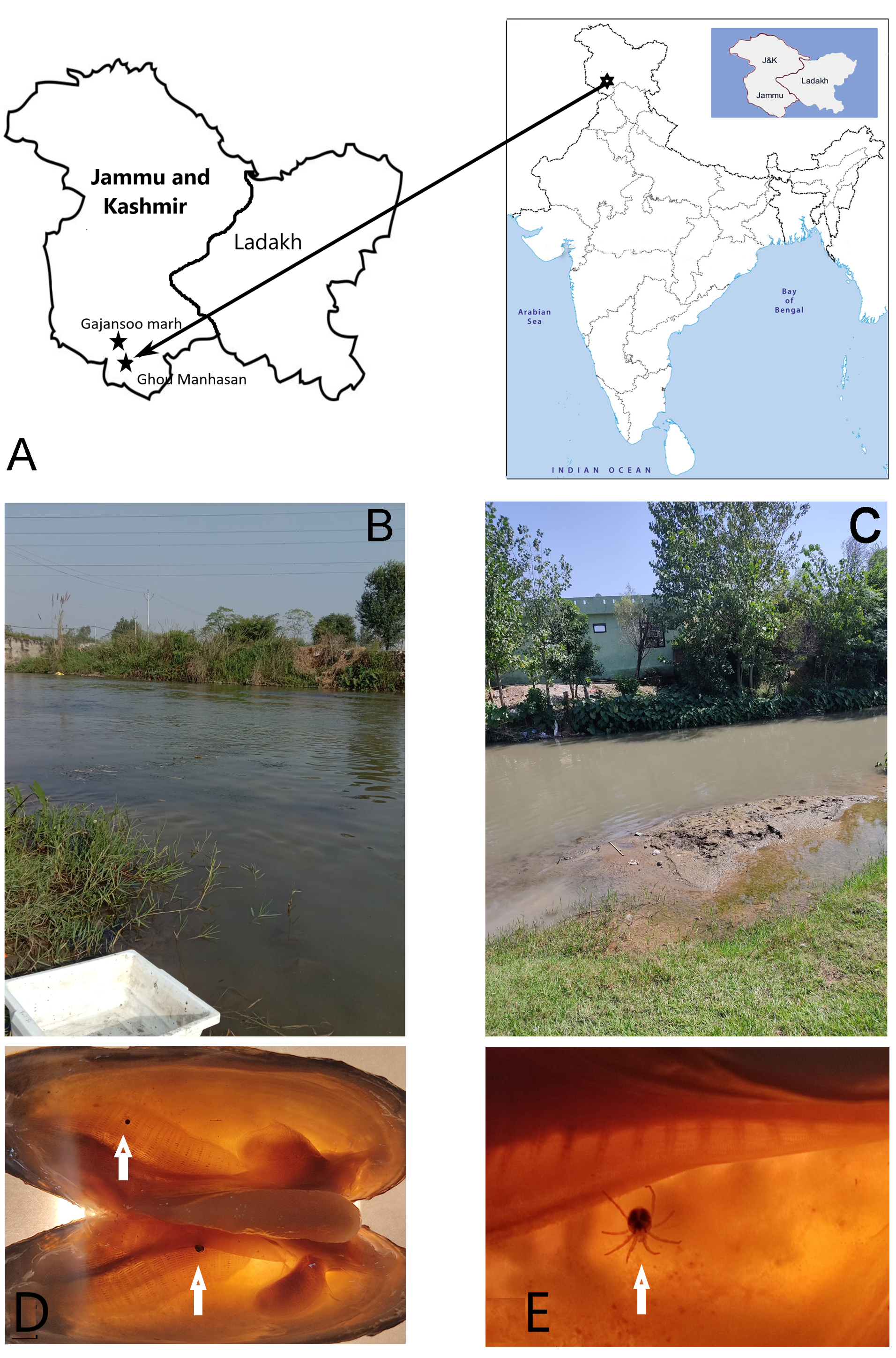 The unionid freshwater mussels were collected by the second author (AAAKK) from two sites in Jammu and Kashmir of India in September-October 2022: 1/. Gou Manhasan, a tributary of River Chenab (32.7232°N; 74.7334 °E), 20 km from Jammu town and Gajansoo Marh, and 2/. a tributary of River Chenab (32.7651°N, 74.7150°E), 12 km from Jammu town - about 2 m from the bank of the river at a depth of 5 cm in the sediment in Jammu and Kashmir of India (Fig. 1B-C). Mites were collected from gills of Corbicula cashmiriensis Deshayes, 1854, Lamellidens corrianus (Lea, 1834), and L. marginalis by manual dissection in a closed chamber using autoclaved surgical blade, forceps and needles (Fig. 1D-E). Mites were taken from the upper layer of gills of C. cashmiriensis and L. marginalis, and from a deeper layer of gills of L. corianus. The mite samples were preserved in 96% ethanol immediately after collecting. For morphological research, permanent slides of mite specimens were prepared.