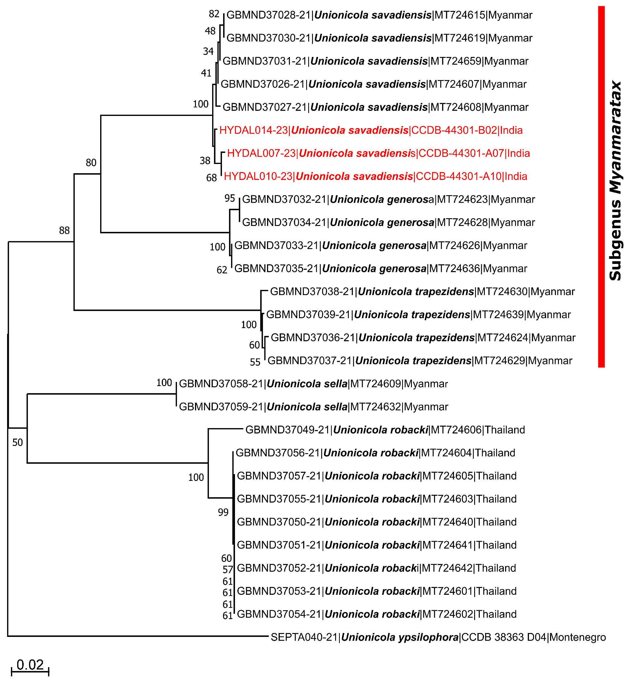 To further confirm the taxonomic status of the examined specimens, 28 COI Unionicola sequences were downloaded from the BOLD database. The Neighbor Joining (NJ) tree was constructed in MEGA X software and displayed in Figure 2. The sequences retrieved from Unionicola specimens from Jammu and Kashmir, formed a distinct cluster with sequences of U. (M.) savadiensis from Myanmar (Fig. 2).