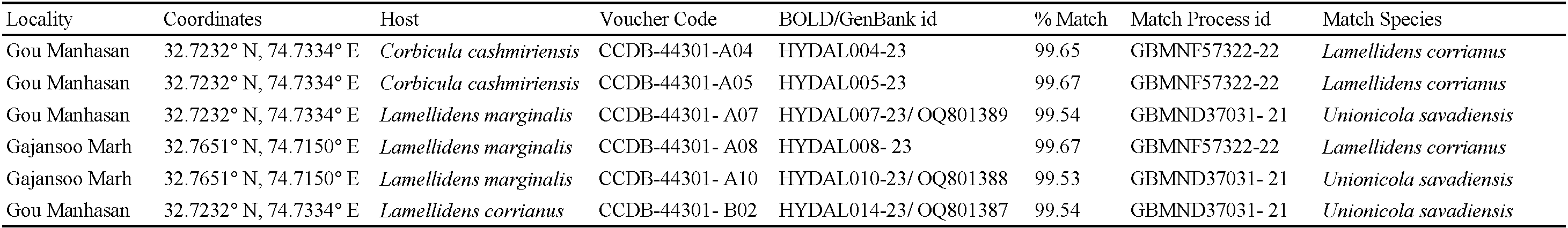A 639-658 bp fragments for three specimens of Unionicola collected from mussels were successfully amplified. Species identification of studied specimens based on BOLD and GenBank databases is shown in Table 1. Three specimens were identified to species level as they showed sequence matches of 99.53-99.54% with U. (M.) savadiensis sequences available in GenBank database. For another three specimens, morphologically attributed to U. savadiensis (two specimens collected in the gills of C. cashmiriensis from Gou Manhasan and one specimen collected in the gills of L. marginalis from Gajansoo Marh; Tab. 1), we amplified and sequenced DNA of the mussel L. corrianus instead of water mite DNA. These sequences showed sequence match of 99.65-99-67% with L. corrianus (AF339457) from India submitted by Lopes-Lima et al. (2021).