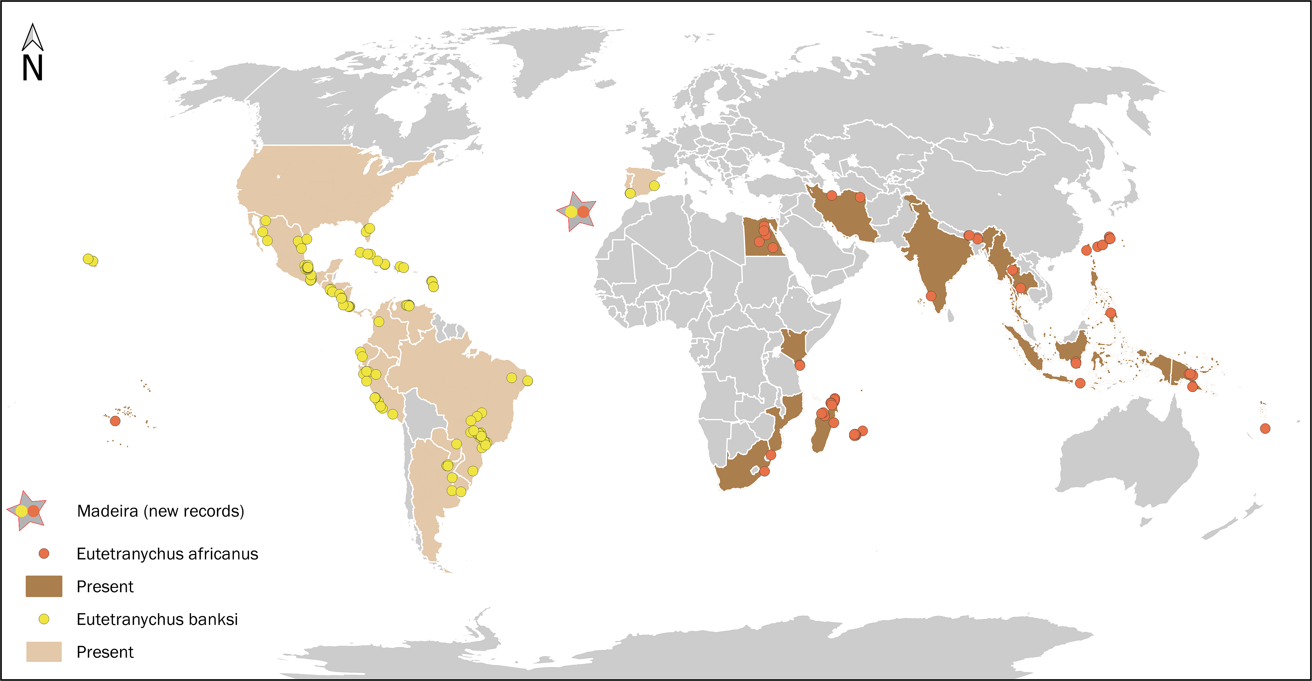 Two alien species belonging to the genus Eutetranychus were detected in Madeira: E. banksi and E. africanus. While E. banksi is already known from Portugal and Spain, the nearest country with the presence of E. africanus is Egypt (Attiah, 1967). The updated distribution map of both species is presented in Figure 1.