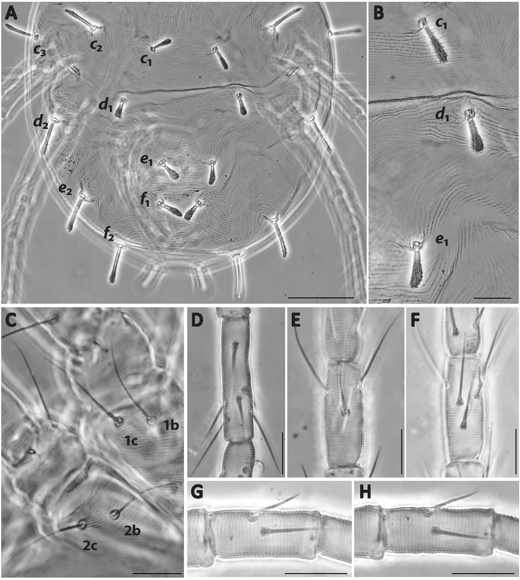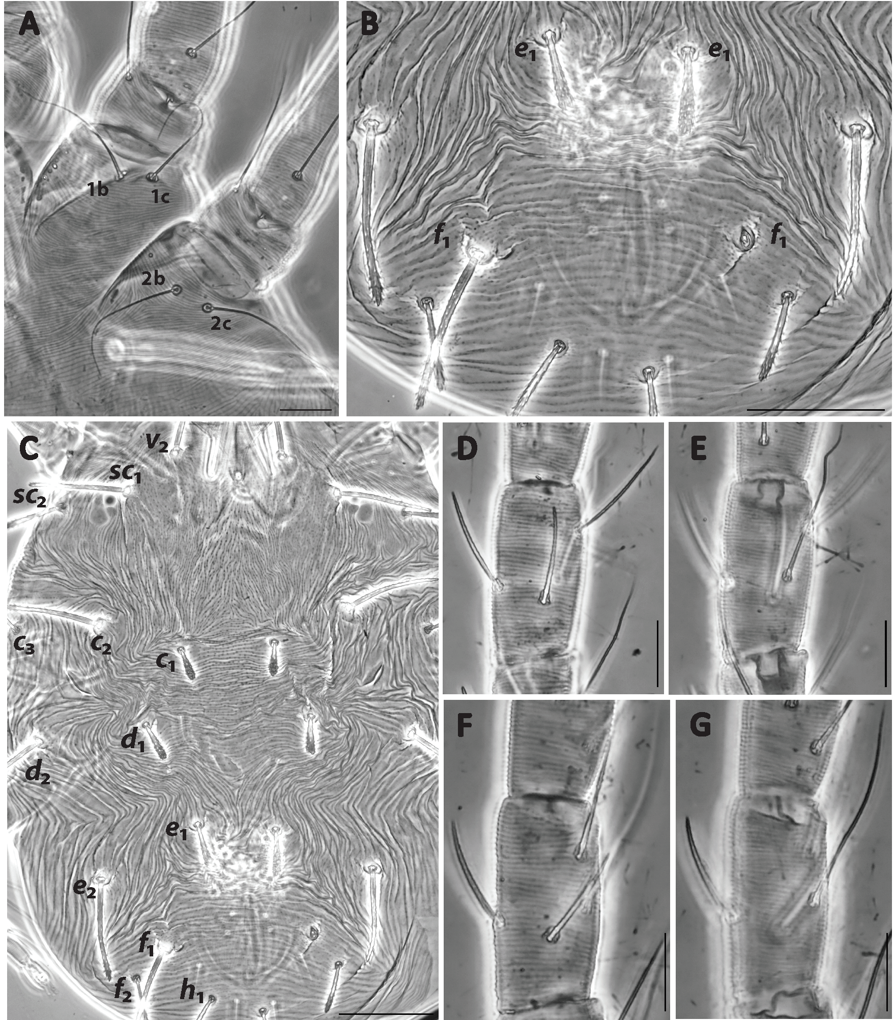 Distinctive characters: females of this species are separated of other species of the banksi-group (16 species, see Kamran et al. 2018) by having coxa II with 2 setae, setae f1 members equally spaced or slightly more widely spaced than setae e1 members, dorsal striation between members of setae d1 and e1 forming a ''V-pattern'', dorsocentral setae c1, d1 and e1 inserted on obvious/prominent tubercles, 6 setae on tibiae II and III, 2 or 3 setae on genu III, 2 setae on genua II and IV (Figure 4).