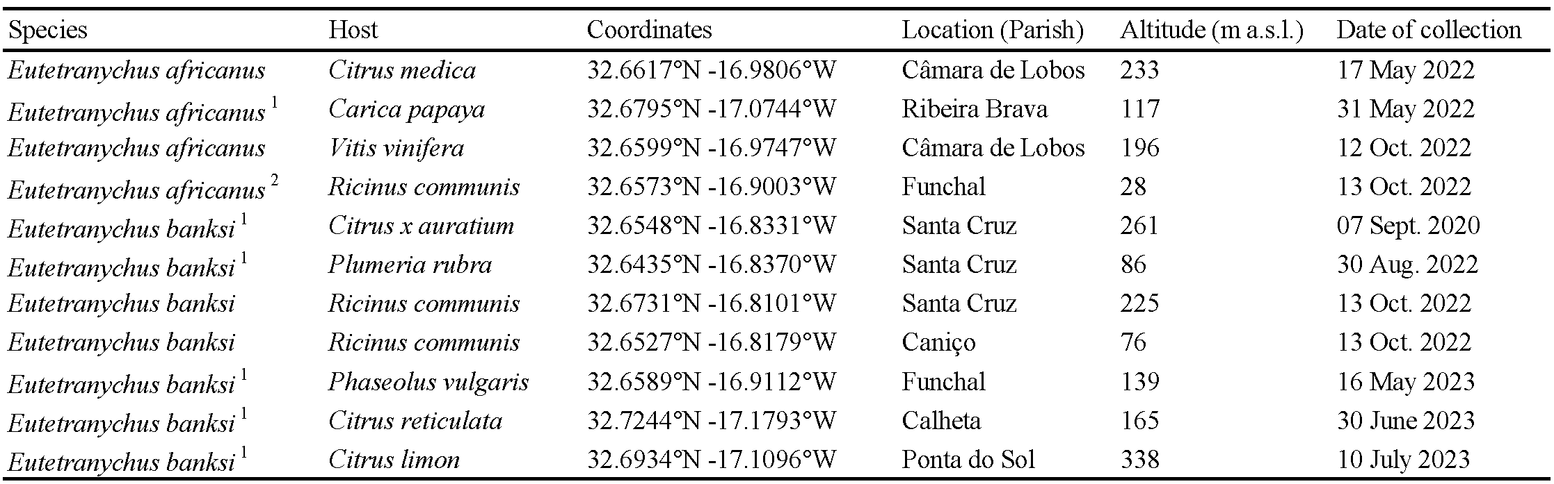 In Madeira Island eight species of spider mites have been reported until now, including alien and ubiquitous species with unknown status such as Eotetranychus lewisi (McGregor), O. perseae, T. evansi, Tetranychus ludeni Zacher and Tetranychus urticae Koch (Naves et al. 2021). Geologically, Madeira is located in the northwest sector of the African Tectonic plate (Brum da Silveira et al. 2012), being a political European territory and a Portuguese Autonomous Region. In this note we report the presence of two additional alien mites for Madeira, the Texas citrus mite Eutetranychus banksi (McGregor), and the African red mite Eutetranychus africanus (Tucker), this being the first report of E. africanus for a European country.