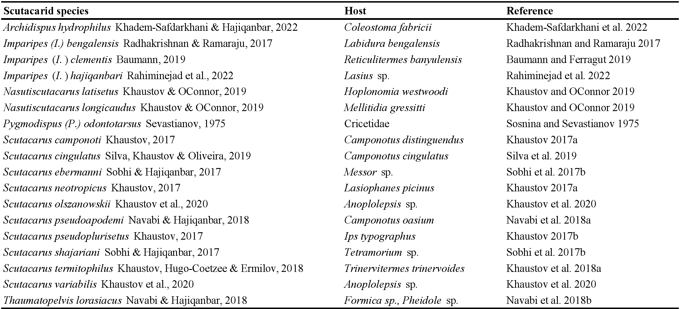 The following new scutacarids have been described as associates of ant species belonging to the subfamily Formicinae (Annex VI): six Scutacarus species Thaumatopelvis lorasiacus Navabi & Hajiqanbar, 2018 and Imparipes hajiqanbari Rahiminejad et al., 2022. Moreover, I. lituanicus Lazauskene & Sevastianov, 1974, which was until now only known from forest litter, has been reported associated with Lasius sp. (Rahiminejad et al. 2022).
