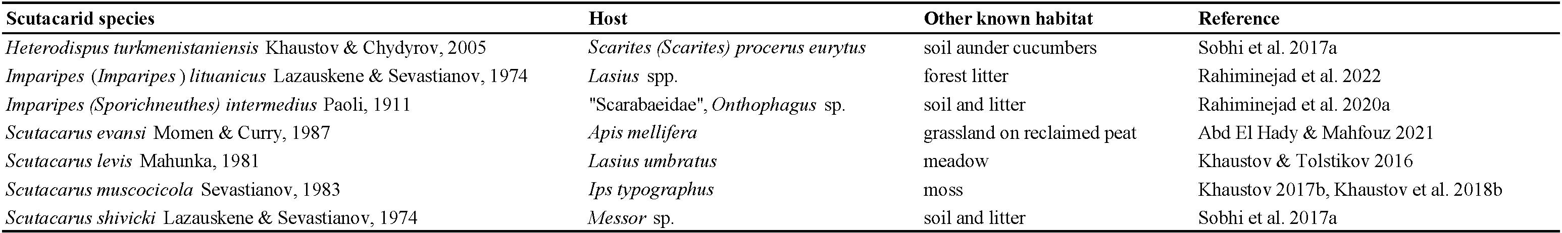 Scutacarus shivicki Lazauskene & Sevastianov, 1974; Iran; p; Sobhi et al. (2017a); new record as phoretic species (so far reported from soil and litter)