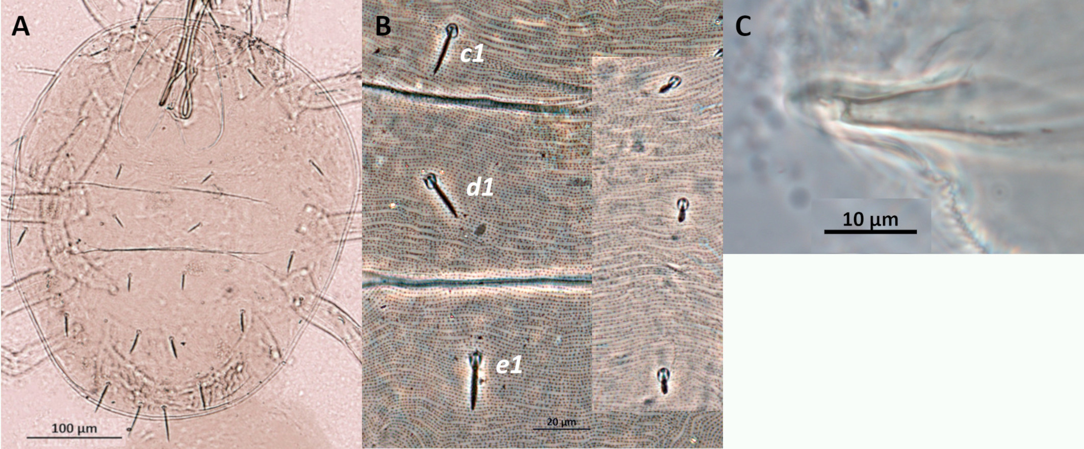 Figure 1. Eotetranychus libocedri: A – dorsal view in habitus; B – dorsocentral setae c1-e1 of females of E. libocedri in comparison with E. thujae (right inset); C – aedeagus.