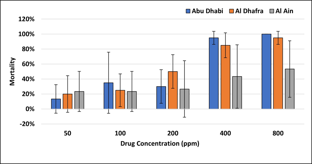 Diagnosing resistance to acaricides is performed primarily through bioassays, the most common being the adult immersion test (AIT) (Whitnall and Bradford 1947), the larval packet test (LPT) (Stone and Haydock 1962) and the larval immersion test (LIT) (Shaw 1966; Dzemo et al. 2022). The current study was undertaken to test for the development of resistance against cypermethrin in H. anatolicum in the Al Ain region using in vitro AIT bioassays and ticks collected from farms in the three regions of the Emirate of Abu Dhabi.