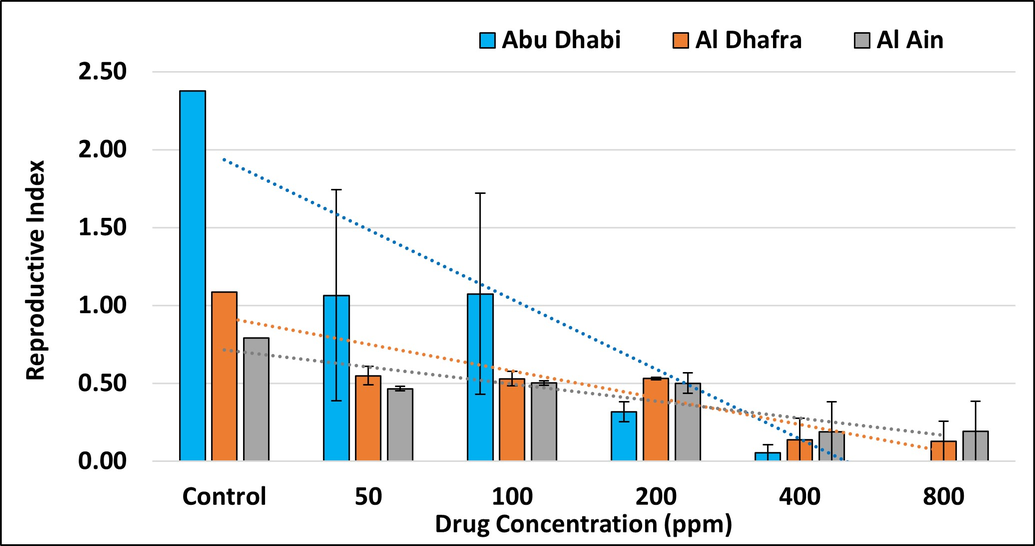 Tick populations have an immense potential for rapidly developing resistance due to their biological and behavioral characteristics, and resistance to different active ingredients has been reported in almost all countries where ticks occur (Alonso-Diaz et al. 2006). Synthetic pyrethroids are the most widely and frequently used acaricides to control tick populations. The present study aimed to detect acaricide resistance to the commonly used pyrethroid acaricide cypermethrin in field-collected Hyalomma anatolicum ticks from selected farms of the Emirate of Abu Dhabi. A concentration dependent increase in adult tick mortality was observed for cypermethrin in Abu Dhabi and Al Dhafra farms ,whereas this relationship was weaker in Al Ain farms (Figure 2). The reproductive index (RI) declined as drug concentration increased (Figure 3), with the strongest decline for ticks from Abu Dhabi farms. In contrast, the inhibition of oviposition increased with the cypermethrin dose (Figure 4) in all farms.