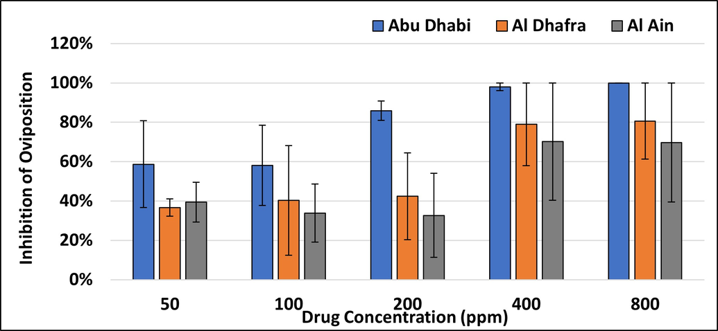 \[ Percent~inhibition~of~oviposition~(IO\%) = \frac{RI~control - RI~treated}{RI~control} × 100 \]