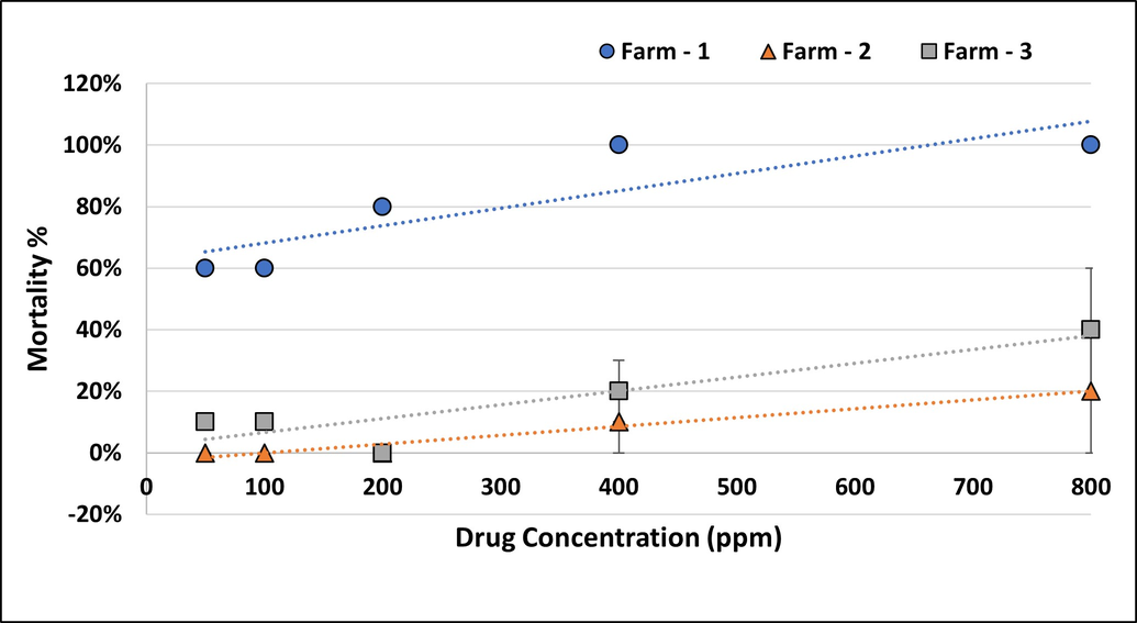 Among the three farms in Al Ain region, two farms namely Al Hamam (Farm2) and Malaqet (Farm3), showed low tick mortality at the tested doses and could not produce 100% mortality even at the highest concentration. (Figure 5). The reproductive indices were not affected and the percent inhibition of oviposition was less than 45% (Figures S1 and S2 in Supplementary Materials). These results indicate the acaricide resistance status of the ticks in these farms, with fully susceptible ticks present on farm 1 and very resistant ticks on farms 2 and 3.
