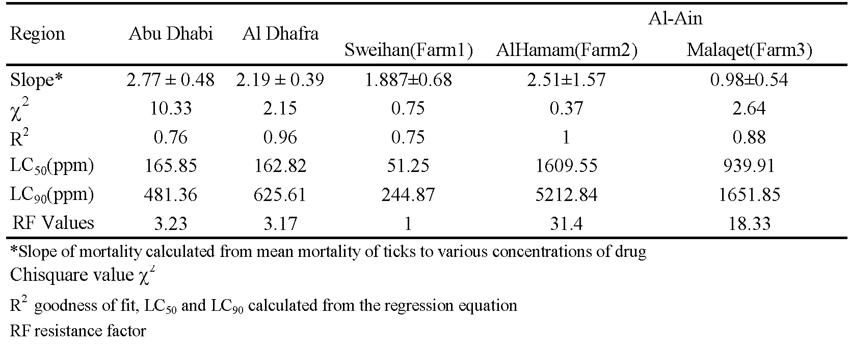 The present study is the first of its kind in this region and throws some light on the resistance status of ticks against a frequently used acaricide. Abu Dhabi and Al Dhafra regions harbour tick populations that are heterogenous in terms of resistance, with LC90 values falling within the discriminating dose reported by earlier studies (Shyma et al. 2013). Hyalomma ticks from Sweihan (Farm 1 in Al Ain) were found to be susceptible to cypermethrin and the discriminating dose (2xLC90) was calculated as 489.74ppm in the present study.