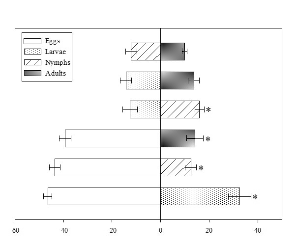 Stethorus tridens showed preference for eggs over others prey-stages of RPM (Figure 1) (χ2 > 37; df = 1; P < 0.0001) and preference for nymphs over larva (χ2 = 6; df = 1; P = 0.0138). In the other combinations there was no difference (χ2 = 0.2; df = 1; P = 0.6248 to larva vs adult; χ2 = 3; df = 1; P = 0.0613 to nymph vs adult). Thus, egg was the stage of development chosen to perform the functional and numerical response of S. tridens.