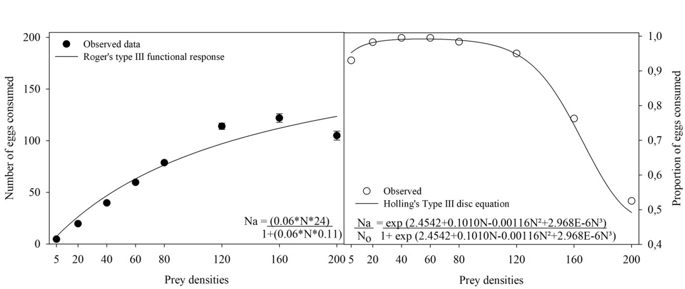 Promising biological control agents can be evaluated through functional and numerical responses, which are key factors that regulate population dynamics in predator-prey systems (Holling 1959). The functional response focuses on changes in individual's consumption rate and food (prey) density (Solomon 1949), while the numerical response focuses on the changes in predator to prey densities (Hassel 1978). Through mathematical and statistical models, it is possible to characterize the type of functional response of the predator (Moffat et al. 2020) and compare its effectiveness with that of other biological control agents (Eini et al. 2023). The functional response involves several parameters, such as handling time (Th) and attack rate (ɑ) (Holling 1959). The handling time corresponds the time spent by the predator to identify, stalk, kill, consume and digest a prey, whereas the attack rate corresponds to proportion of prey captured by each predator per time unit (Holling 1959).