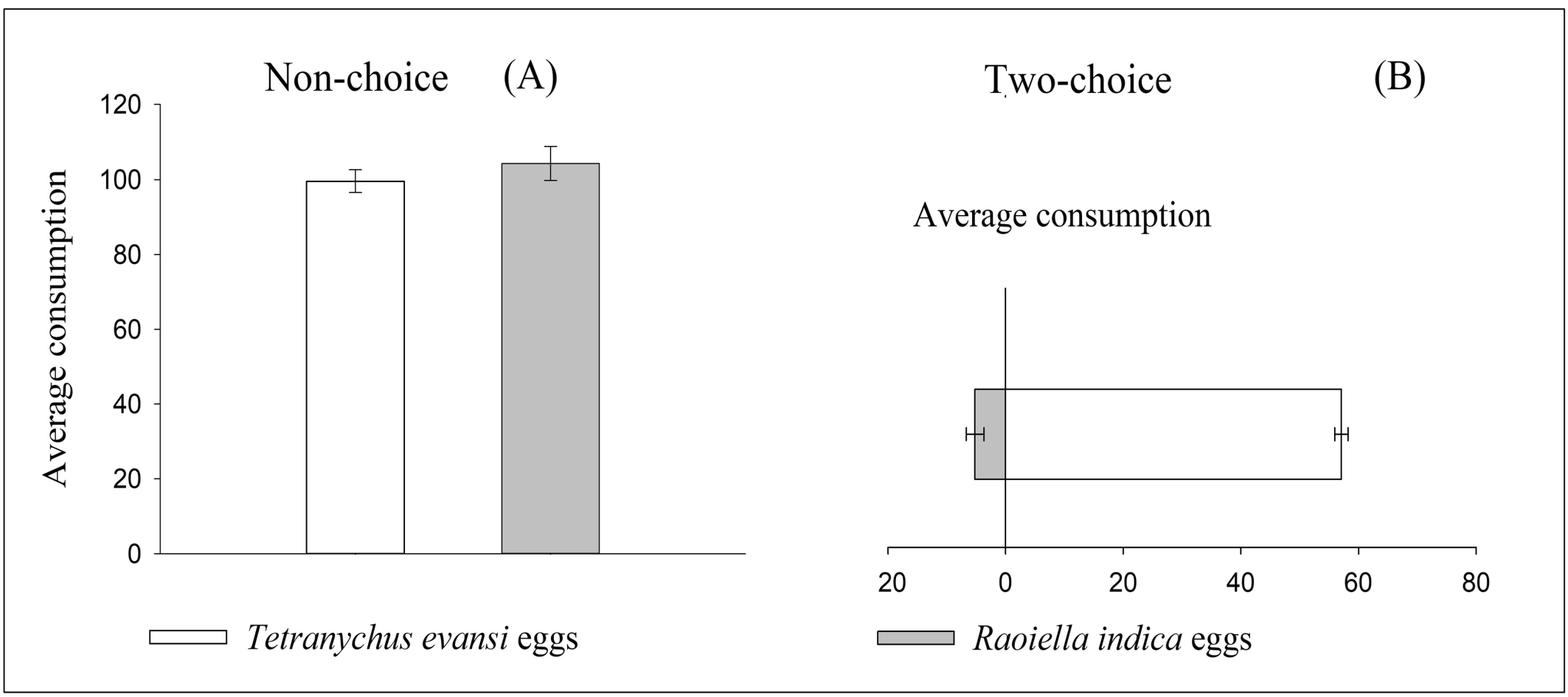 The objective of this study was to investigate S. tridens preferences among different developmental stages of RPM and estimating the functional and numerical responses of S. tridens over its most preferred prey-stage of RPM. Additionally, the prey preference of S. tridents was examined between eggs of Tetranychus evansi Baker & Pritchard (its natural prey) and eggs of RPM through two-choice and non-choice experiments.