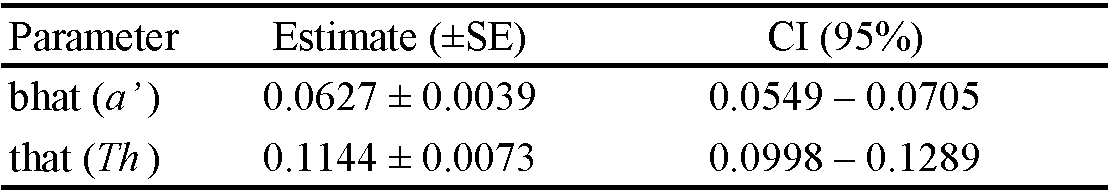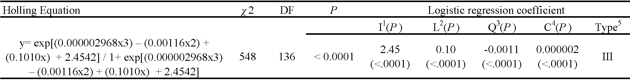 The RPM eggs were transferred from the rearing unit to the experimental unit and randomly distributed at densities of 5, 10, 20, 40, 60, 120, 160, or 200 eggs/experimental unit. Adult females of S. tridens, of unknown age were removed from rearing and kept under food deprivation for 4 h before being confined to the experimental units. After 24 h of confinement, the number of eggs consumed and deposited was counted. To determine the type of functional response, a logistic regression of the proportion of prey consumed as a function of the density of prey offered was performed using the protocol described by Juliano (1993) (using Proc. CATMOD of SAS, SAS Institute 2008). Based on the obtained equation, the significance of the regression coefficient and sign of the linear coefficient were observed to determine the type of functional response. When not significant, the linear coefficient indicated a type I response (linear increase in prey consumption as a function of density); when negative and significant, the response was type II (rapidly increasing prey consumption as a function of density, passing through reduction until stabilization, plateau); and when positive and significant, the response was type III (accelerated increase in prey consumption with prey density, presenting a sigmoidal response) (Holling 1959). Because the experiments were conducted with prey depletion, the attack rate (a) and handling time (Th ) were estimated using the equation \(Ne = N_0 \{1 - exp [ (d + bN_0) (T_h N_e – T) / (1 + cN_0) ] \}\) (Rogers 1972), using nonlinear regression with the least squares method (using ProcNLIN of SAS, SAS Institute 2008), where Ne is the number of prey consumed during time T, N0 is the initial density of the prey, a is the coefficient of the attack rate (ratio of prey captured by the predator to search time), and Th is the handling time (the time required for the predator to identify, stalk, kill, consume, and digest the prey); and b, c, and d are constants of the function that relate a and N0 in the type III functional response: \(a = (d + bN_0) / (1 + cN_0)\).